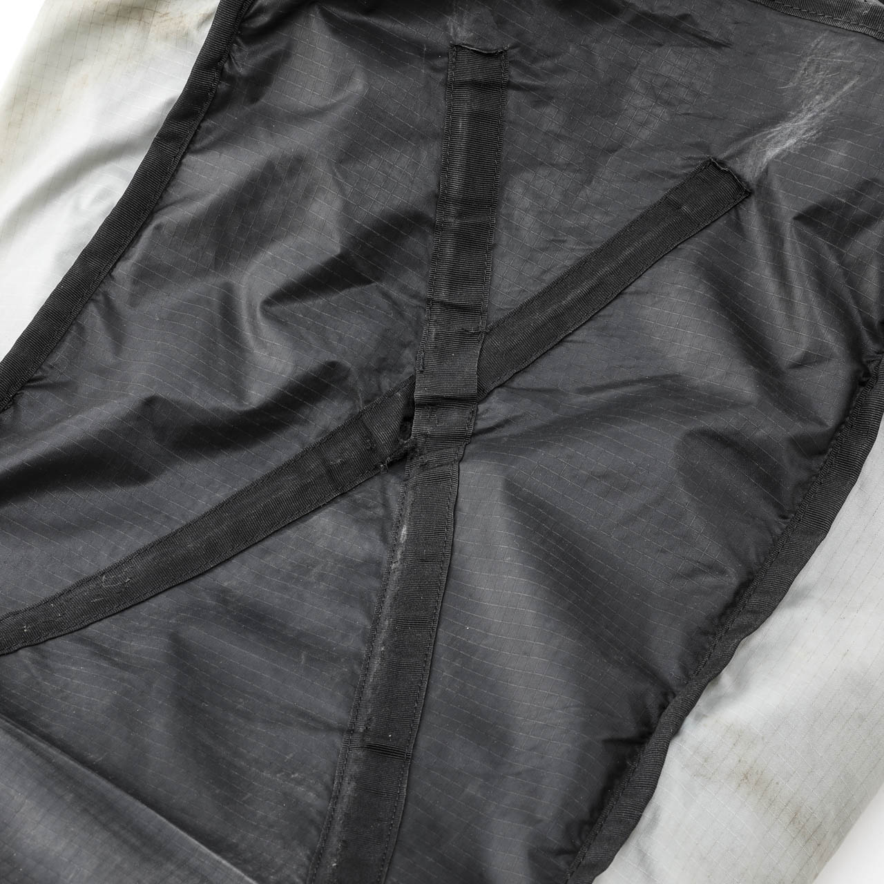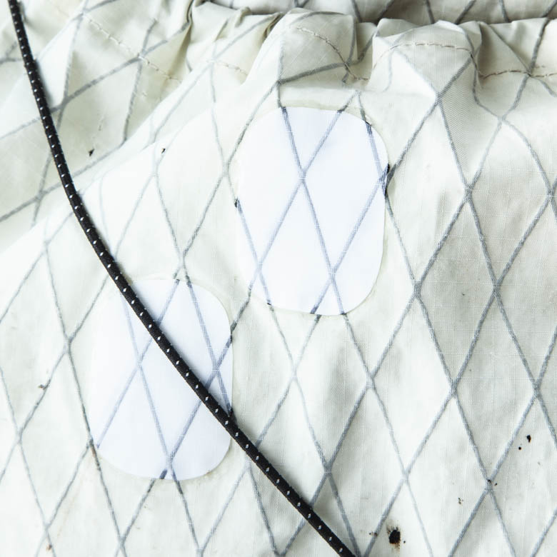 The hole in the front pocket is repaired by using a symbiotic double-sided adhesive sheet. The patch may be noticeable, especially on white X-PAC, because the fabric is often discolored after use.