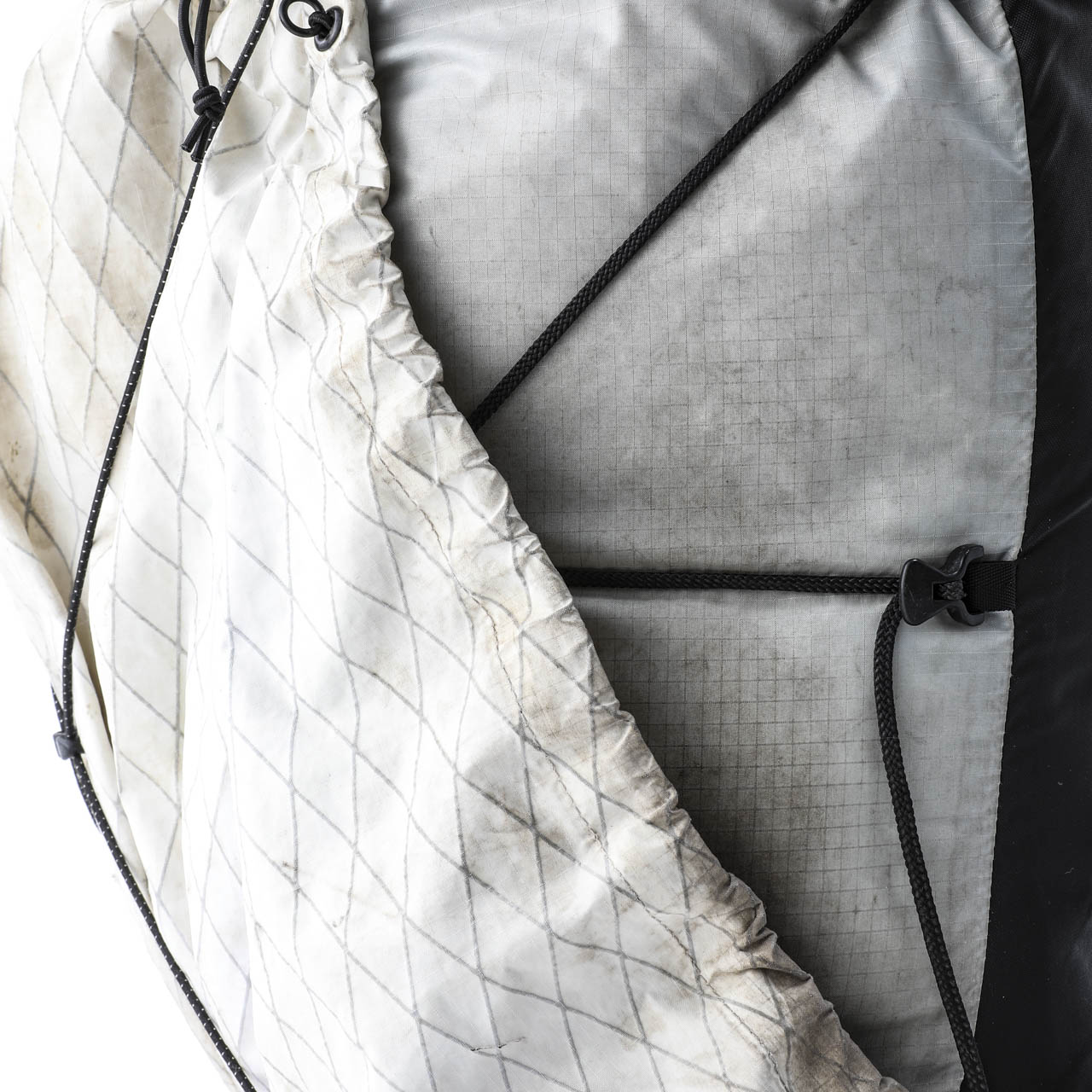 There are multiple holes in the front pocket area. The X-PAC VX07 used for the pocket fabric of this ONE is a relatively strong fabric, but it may develop holes if it is continuously hit by sharp objects or comes in contact with rocks. Also, as the fabric degrades over time, its strength decreases.
