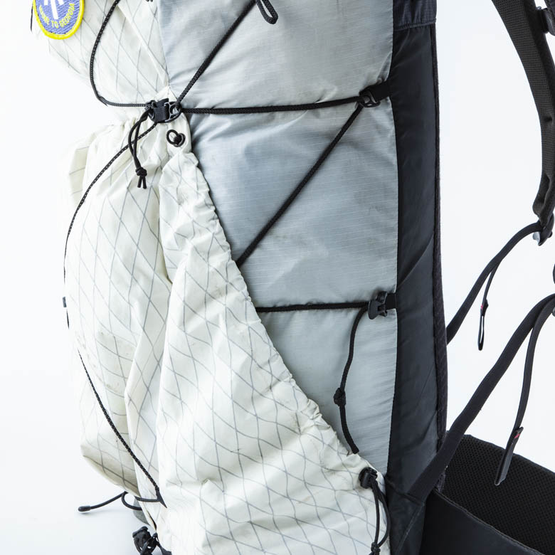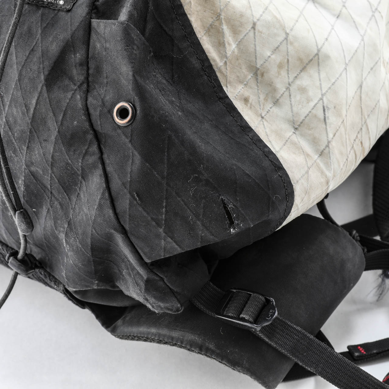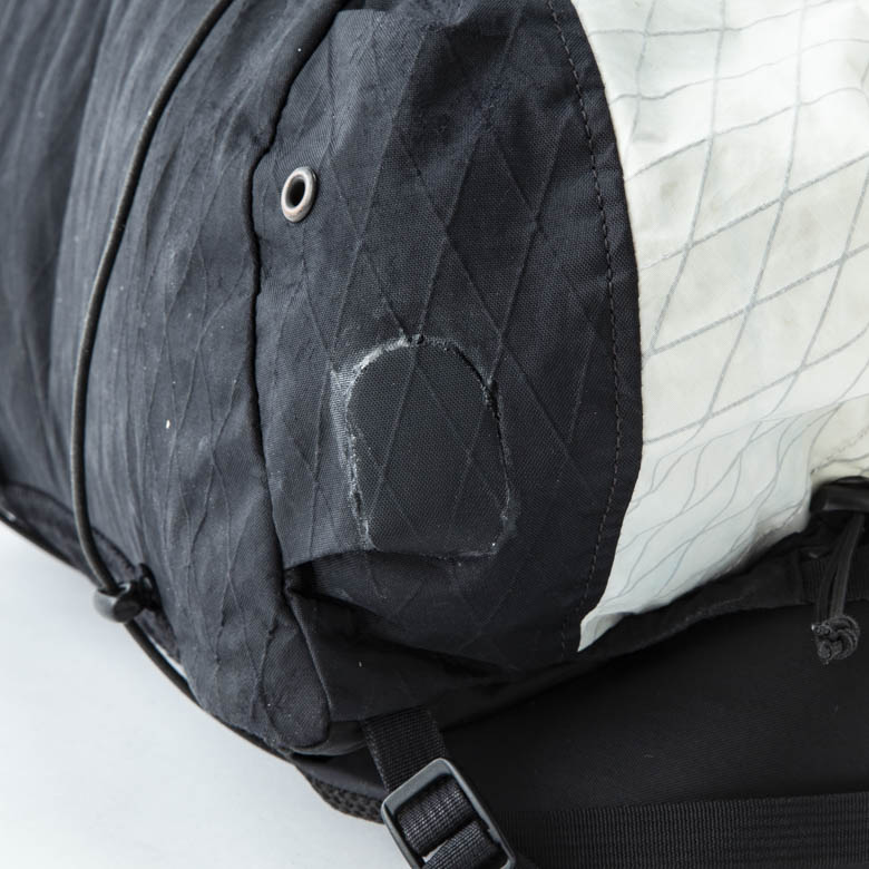 A couple holes on the bottom of the side pockets that seemed to be made from contact with sharp objects. The bottom uses X-Pac VX21/VX42, a more durable fabric than the body.