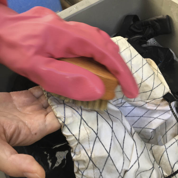 Clean the pockets of the X-PAC material by dipping them in warm water blended with neutral detergent. A laundry brush and a toothbrush were very effective for the smallest parts. I recommend using “Utamaro,” a neutral detergent previously introduced in a Repair Diary.