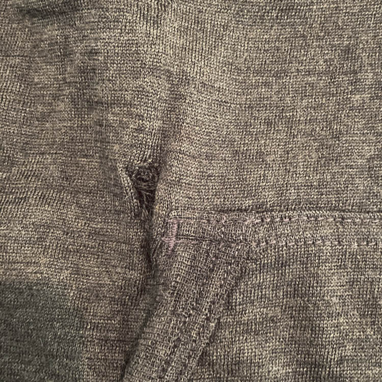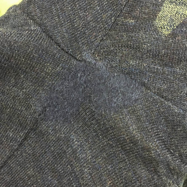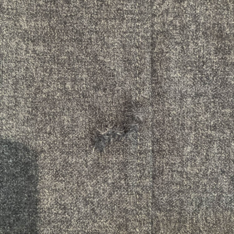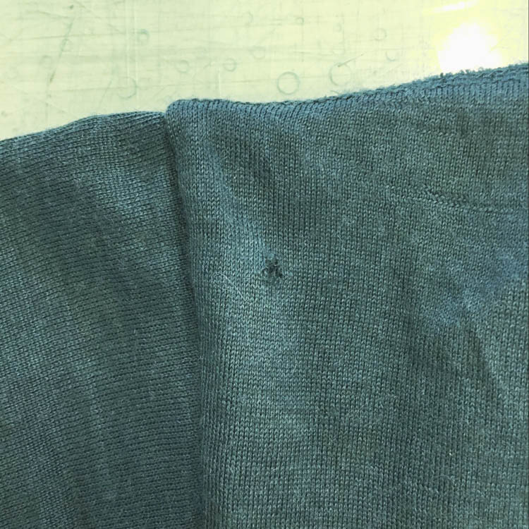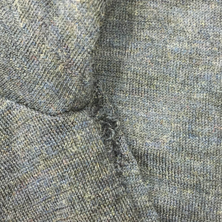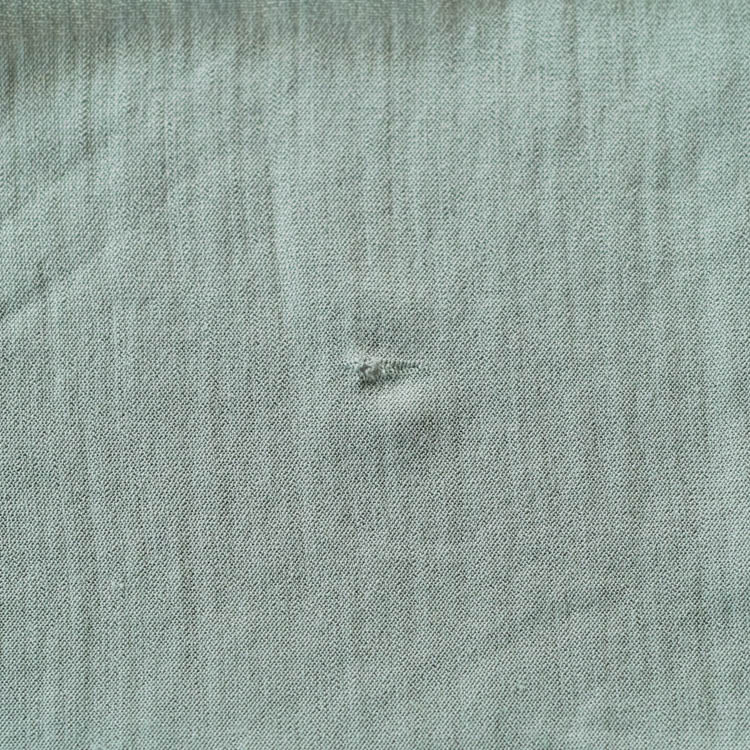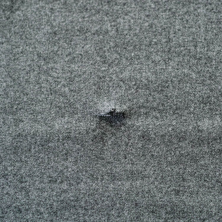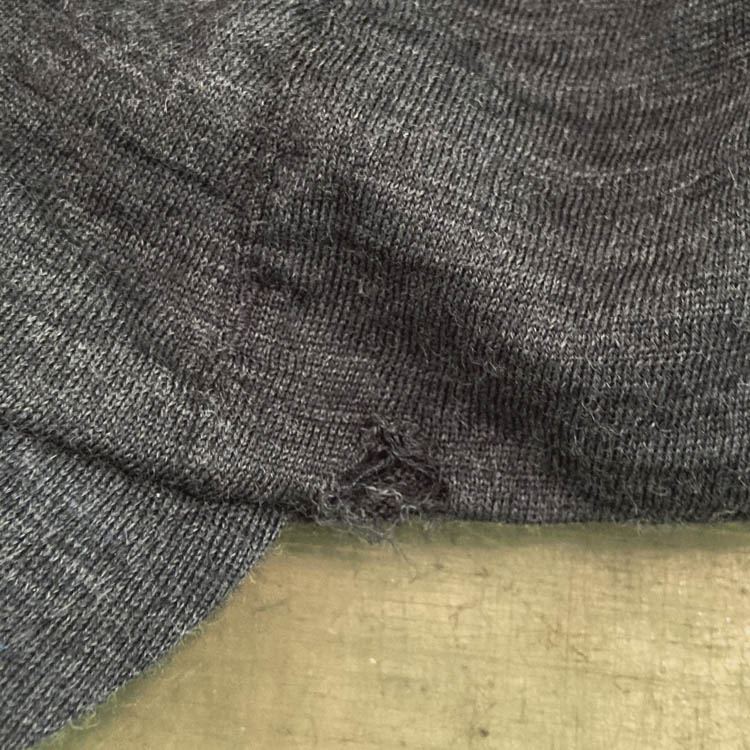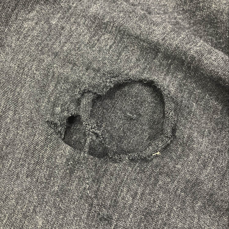 Due to the nature of knitted fabrics, holes can form from weakened fibers due to insect damage or friction. Initially, these holes may be small, but they can quickly widen if left unattended. Since it’s easy to overlook, it’s a good idea to occasionally inspect the fabric under light to identify any holes.