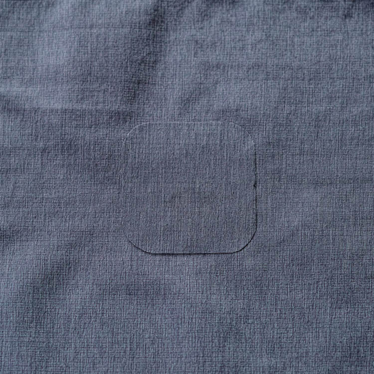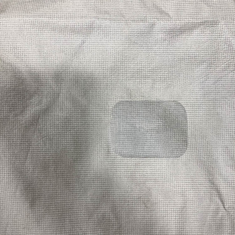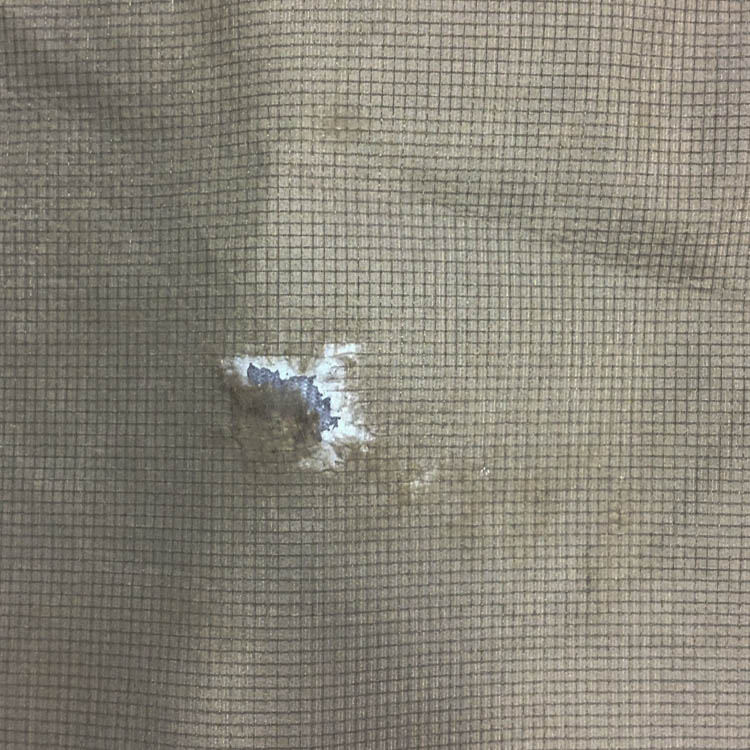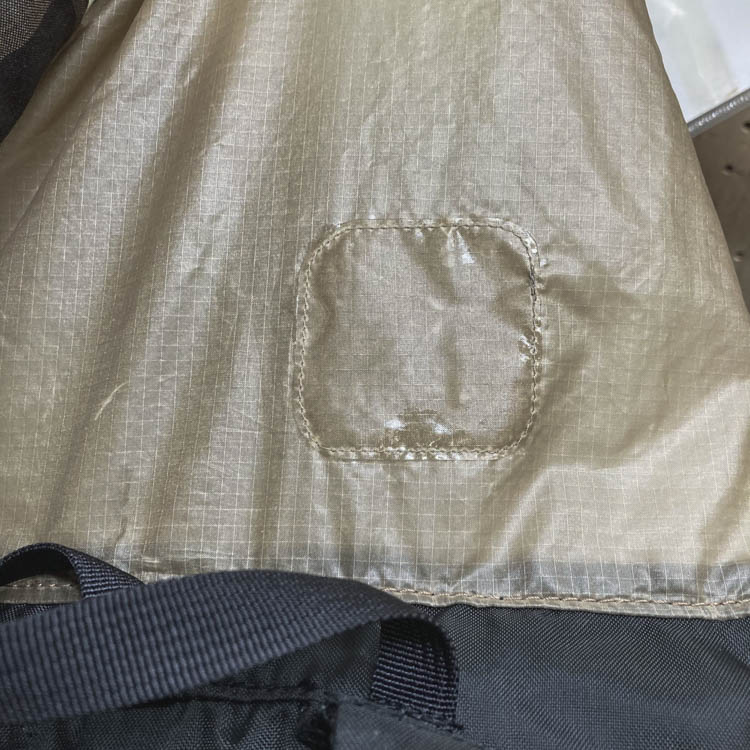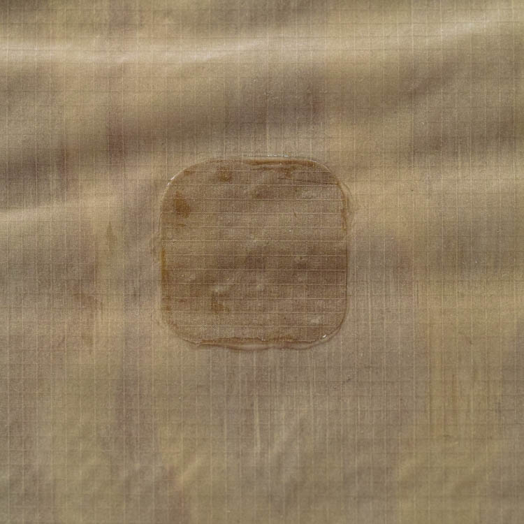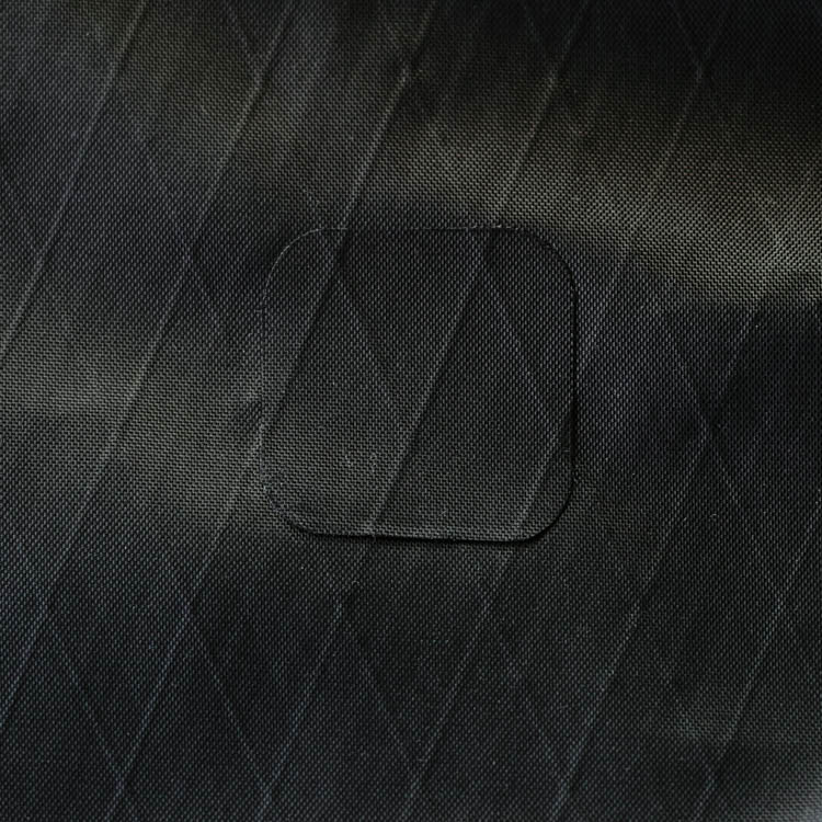 For silicone-coated nylon fabrics used in backpack bodies and similar areas, double-sided adhesive sheets cannot be used due to the silicone coating. Therefore, we repair by adhering a patching fabric with silicone-specific adhesive.