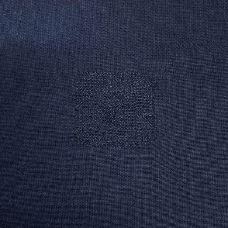 Fabrics made from natural fibers tend to have thicker yarns compared to synthetic fibers, making them more prone to fraying. Additionally, due to the pronounced surface texture, adhesive bonding with repair sheets is not feasible. Therefore, for hole repairs, we use a patching fabric as an underlay and mend it with a sewing machine.