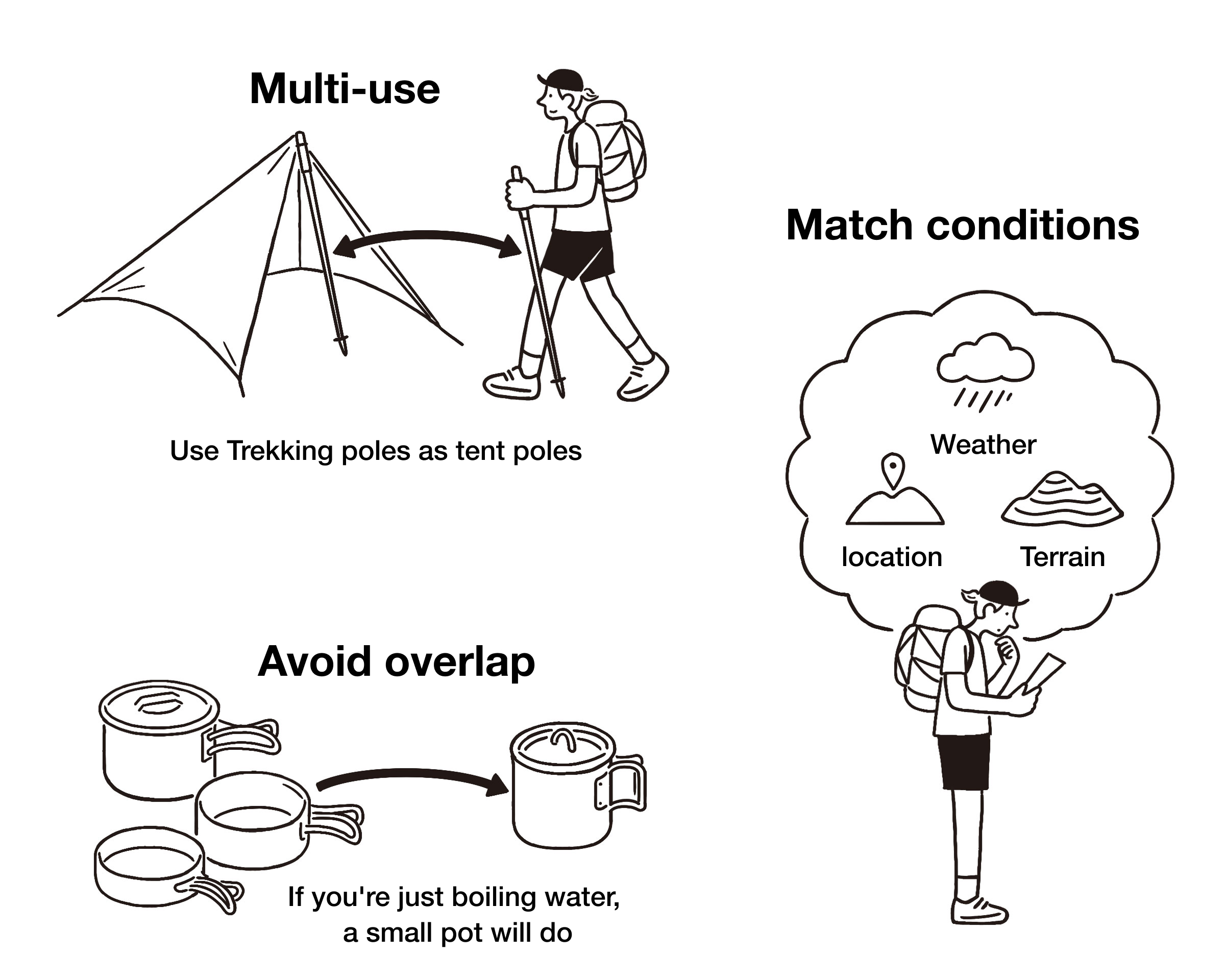 Look carefully for overlap in your kit. Are there multiple items serving the same role, such as extra insulation or redundant cookware? The key is learning to subtract: if one item covers the job, another may not be needed. - Match conditions
