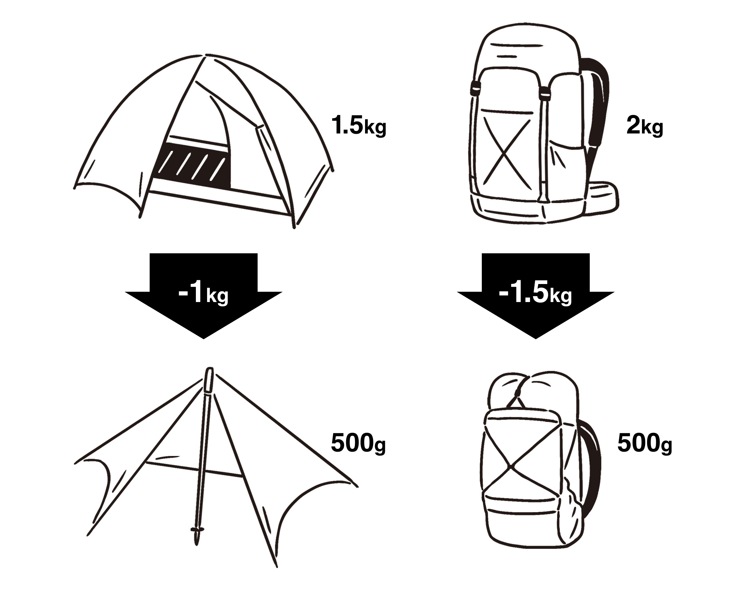 For example, switching from a standard rain jacket to a lighter model might save only 100 to 200 grams. But choosing a 500 g floorless shelter instead of a 1.5 kg double-wall tent saves 1 kg. Choosing a 500 g frameless backpack instead of a 2 kg framed backpack saves 1.5 kg. Starting with the heavier, bulkier pieces is where the biggest gains are.