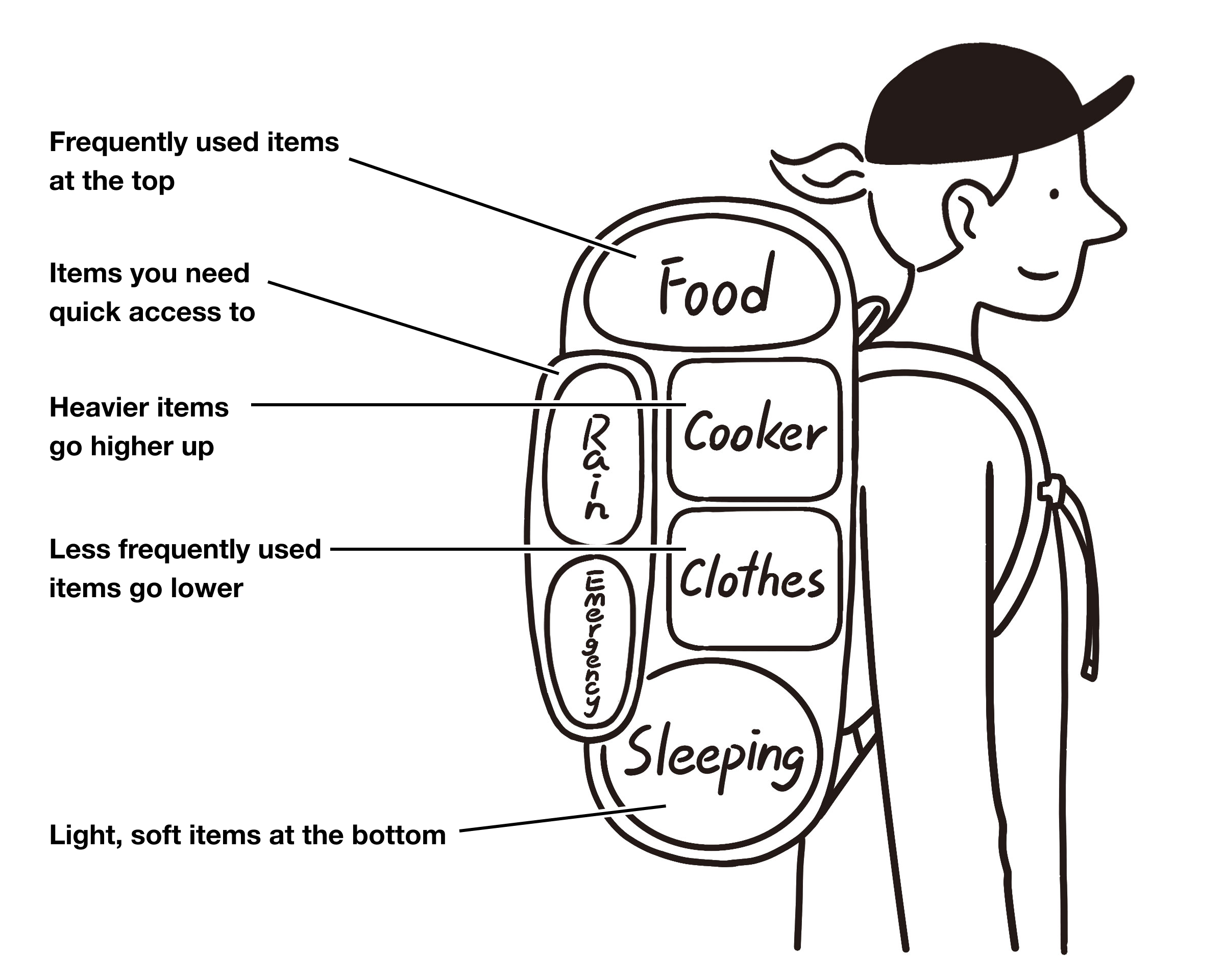 With a frameless backpack, proper packing is essential for a comfortable hike. It is also another place where the idea of multi-use comes into play. A sleeping pad, for example, can be rolled into a cylinder or placed against the back panel to give the pack structure and create a virtual frame. Where you place each item—based on its weight and how often you will need it—can dramatically change how the pack feels on your back.