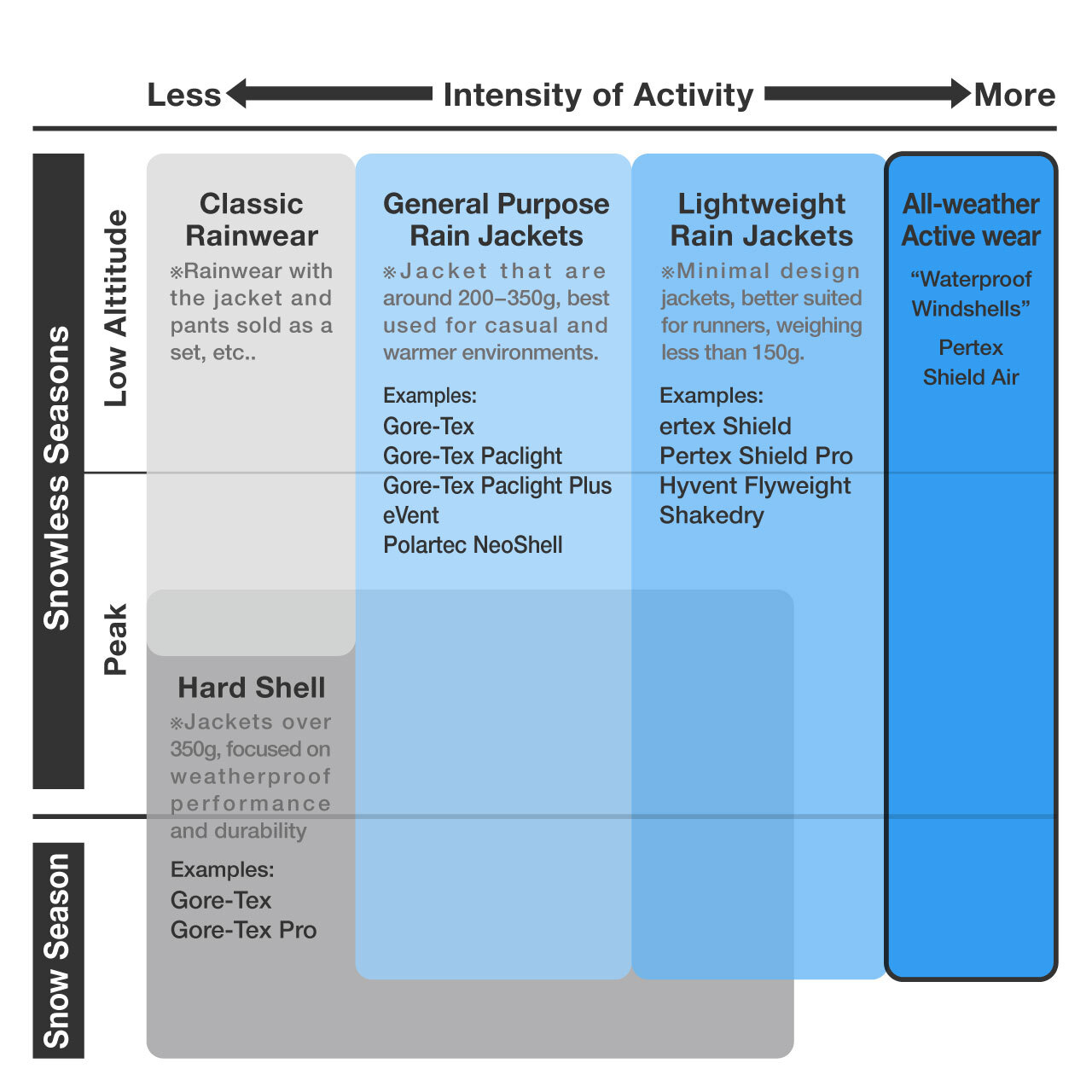 The following is a previous graph from “Rainwear #2” (English not available.) The graph maps out major fabrics in the market, arranged by situation/environment (vertical axis) and amount of exertion (horizontal axis), modified based on the latest product trends and subsequent studies.