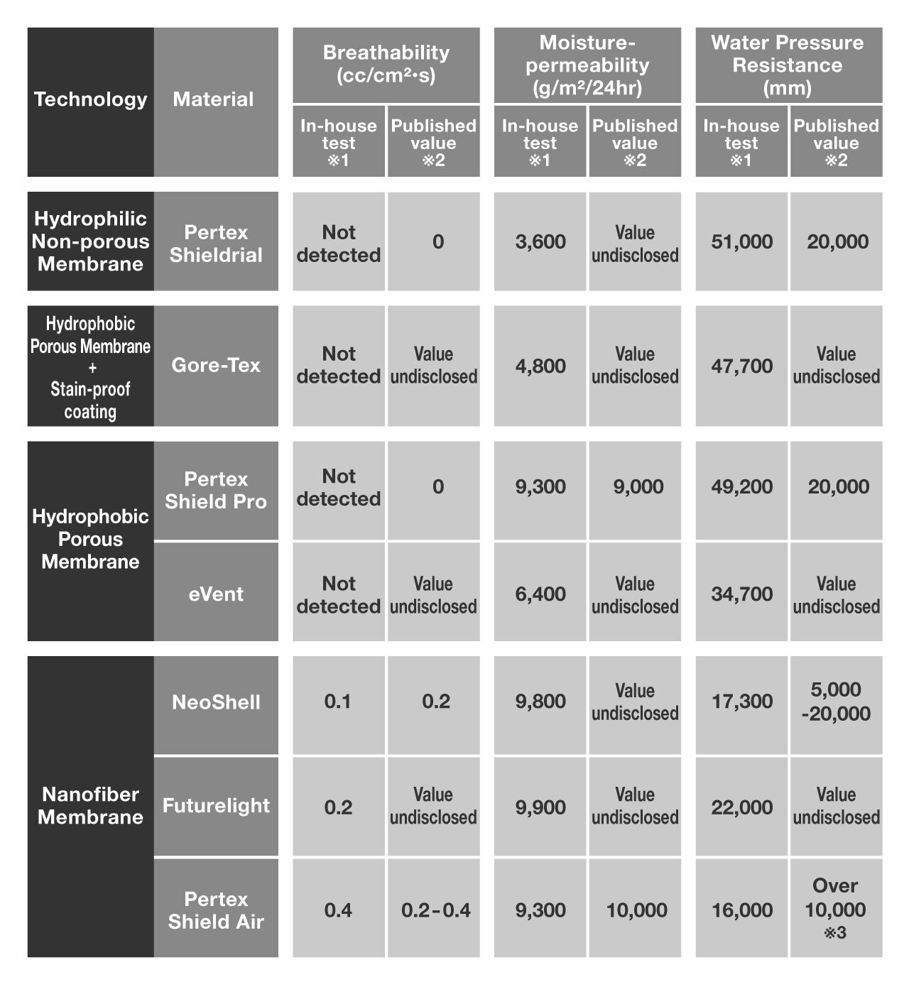 *Results of the in-house tests at an inspection agency. Breathability is measured by the “JIS L 1096 Frazier method”, moisture-permeability by the “JIS L 1099A-1 method”, and water pressure resistance by the “JIS L 1092 B method (Kpa converted to mm)”. Values of moisture permeability and water pressure resistance are rounded off. The sample materials may vary in quality and type. The results may differ depending on which part of the fabric was tested, so the values are for reference only.