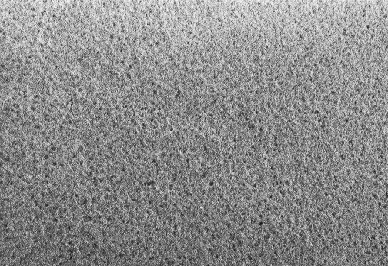 1000x electron microscope image of a polyurethane-based porous membrane (Pertex Shield Pro). The pores are stretched but not enlarged.