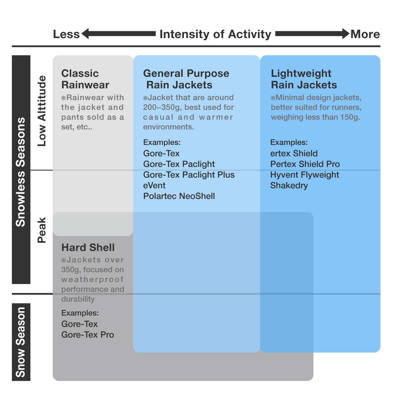 The following is a previous graph from “Rainwear #2” (English not available.) The graph maps out major fabrics in the market, arranged by situation/environment (vertical axis) and amount of exertion (horizontal axis), modified based on the latest product trends and subsequent studies.
