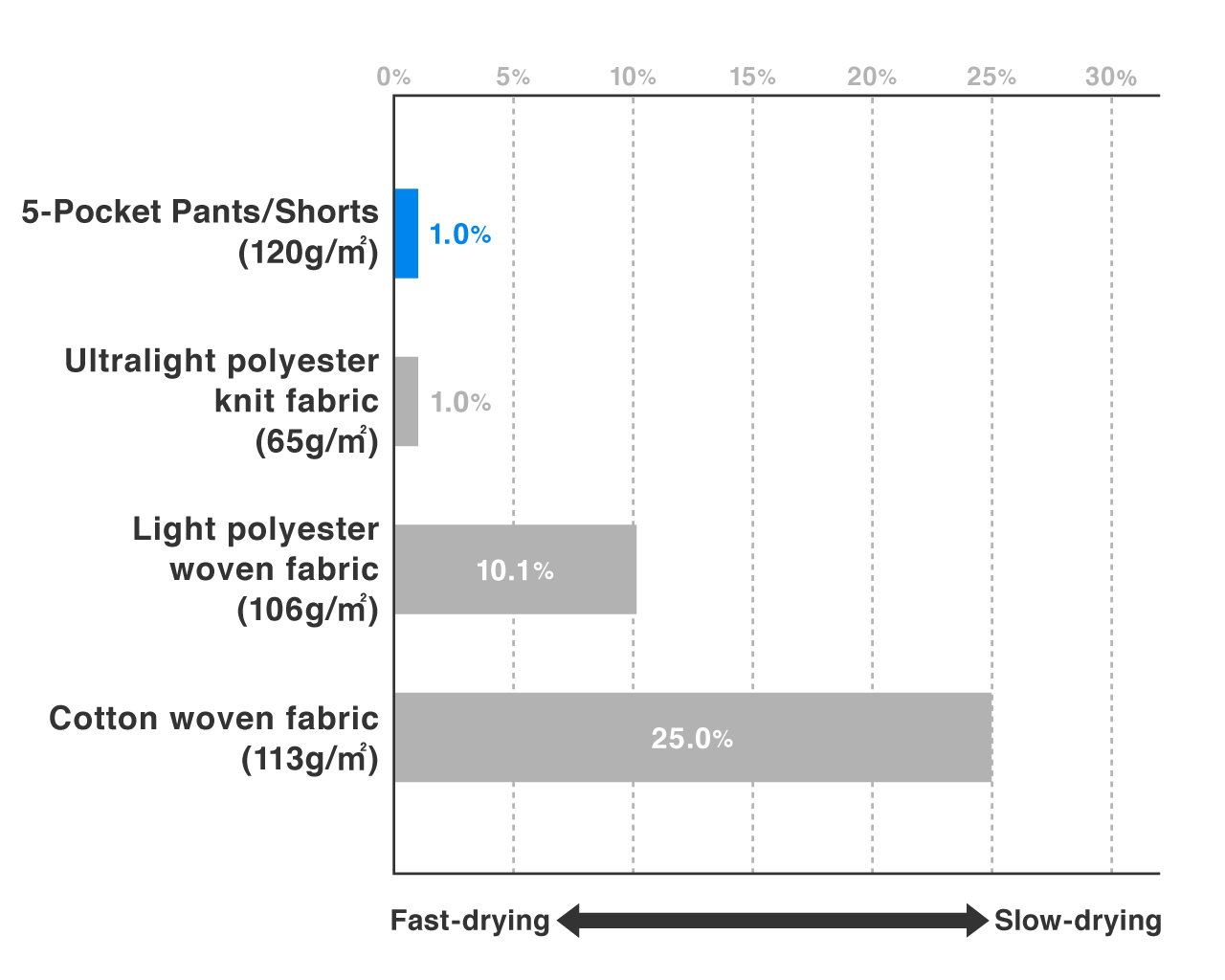 Check out the chart below to see just how quickly the 5-Pocket Pants outperform other fabrics in drying time.
