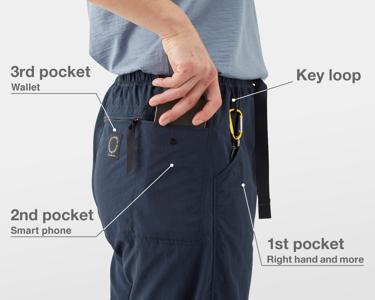 Yamatomichi 5-Pocket design can neatly store your map, snack, wallet, and other items you need during hiking, without interfering with your leg movement.
