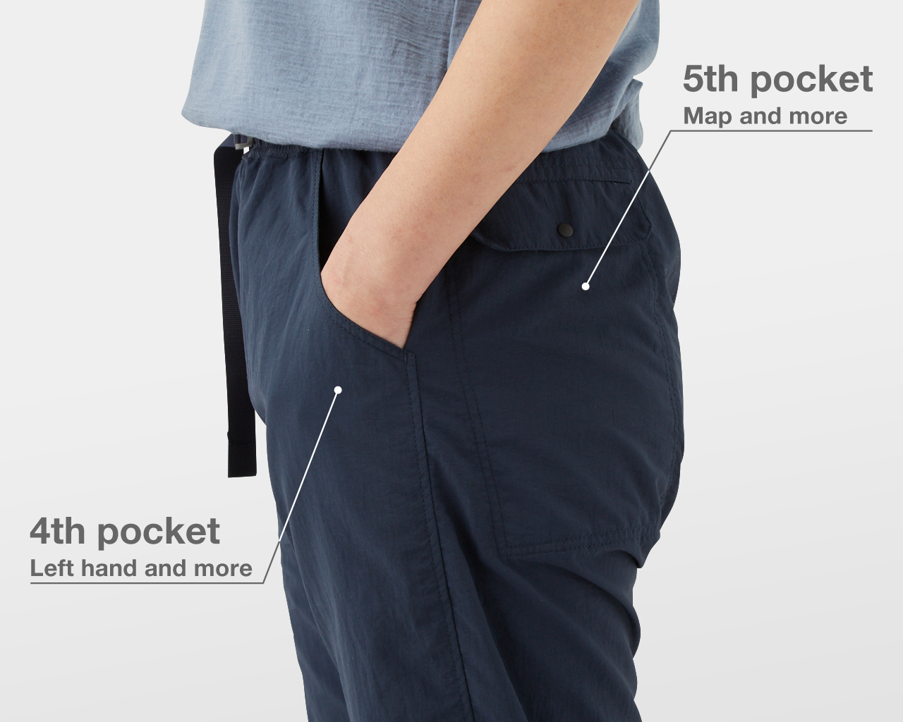 Though the material is non-stretchable, the outstanding ease of movement is achieved by our proprietary pattern and the three-dimensional sewing. The pants are stress-free and comfortable even when you have to raise your leg high on a steep trail.