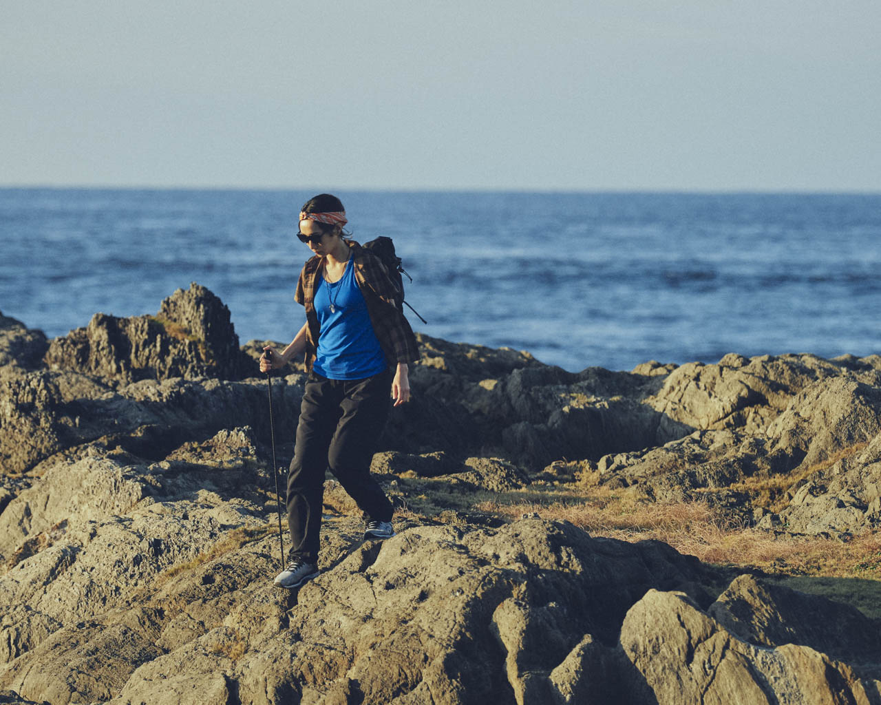 The result, a unique pattern that allows full freedom of movement, letting you hike Japan’s steep mountains in comfort. The fabric is highly durable for rough use, dries quickly when wet, and features pockets that neatly store essentials like maps and trail snacks.