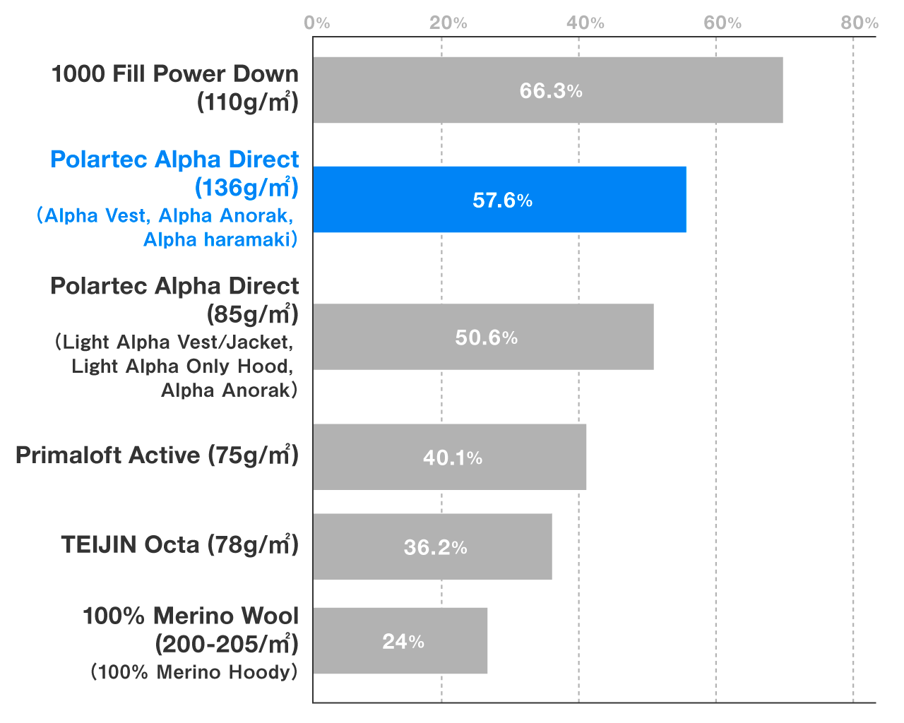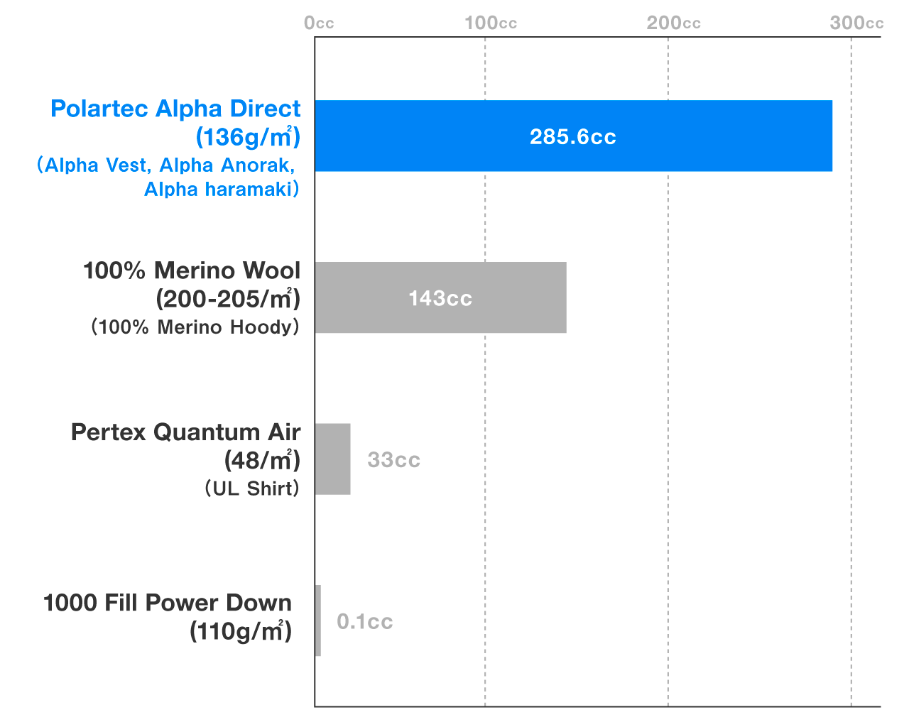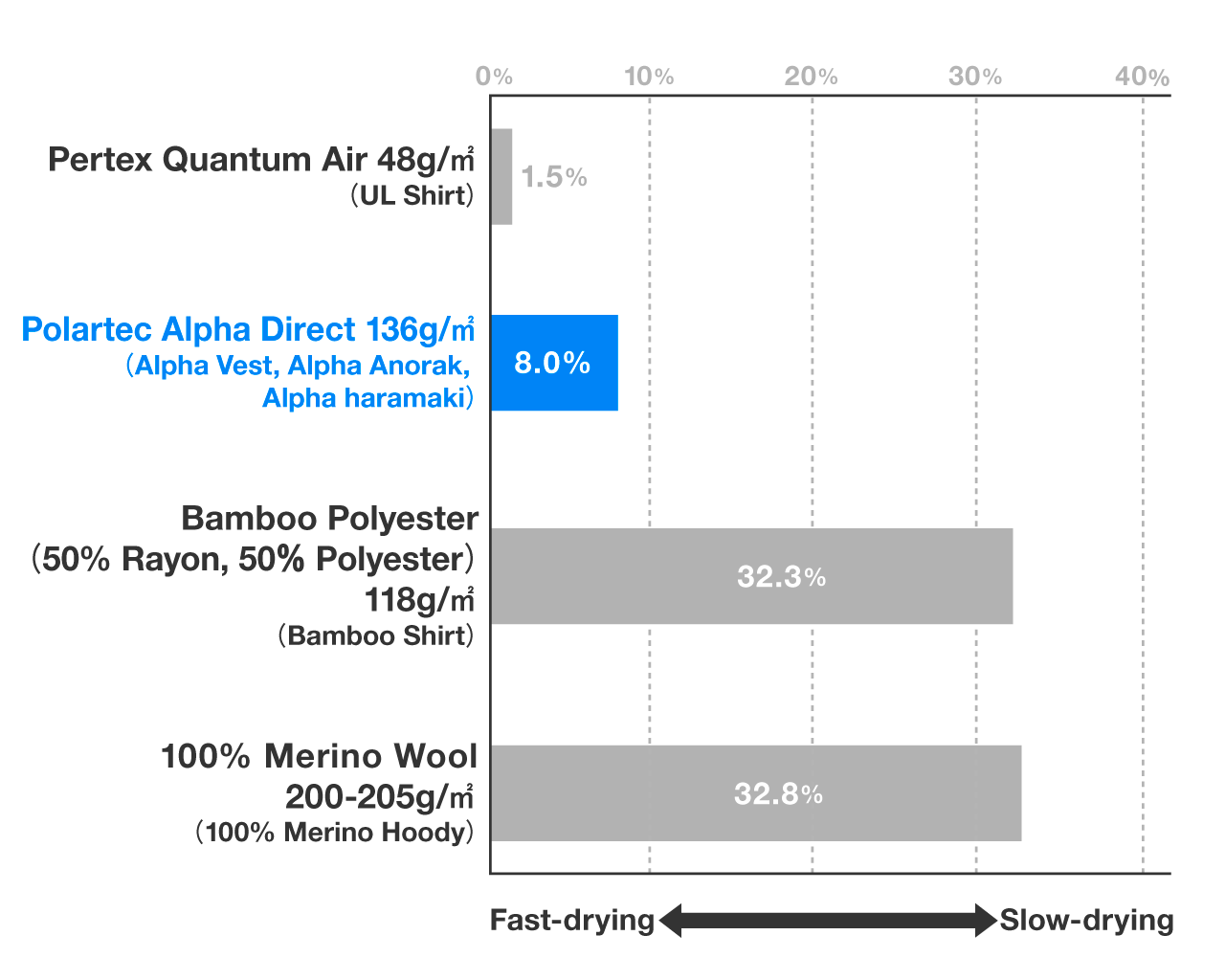 The below chart compares the fast-drying performance of middle layer products. It is shown that Alpha Direct is not as fast-dry as the extremely fast-drying Pertex Quantum Air (UL Shirt), but the moisture content after spin-dry is much lower than that of wool and other fabrics, and even when wet, it dries quickly if lightly wrung out or worn for some time.