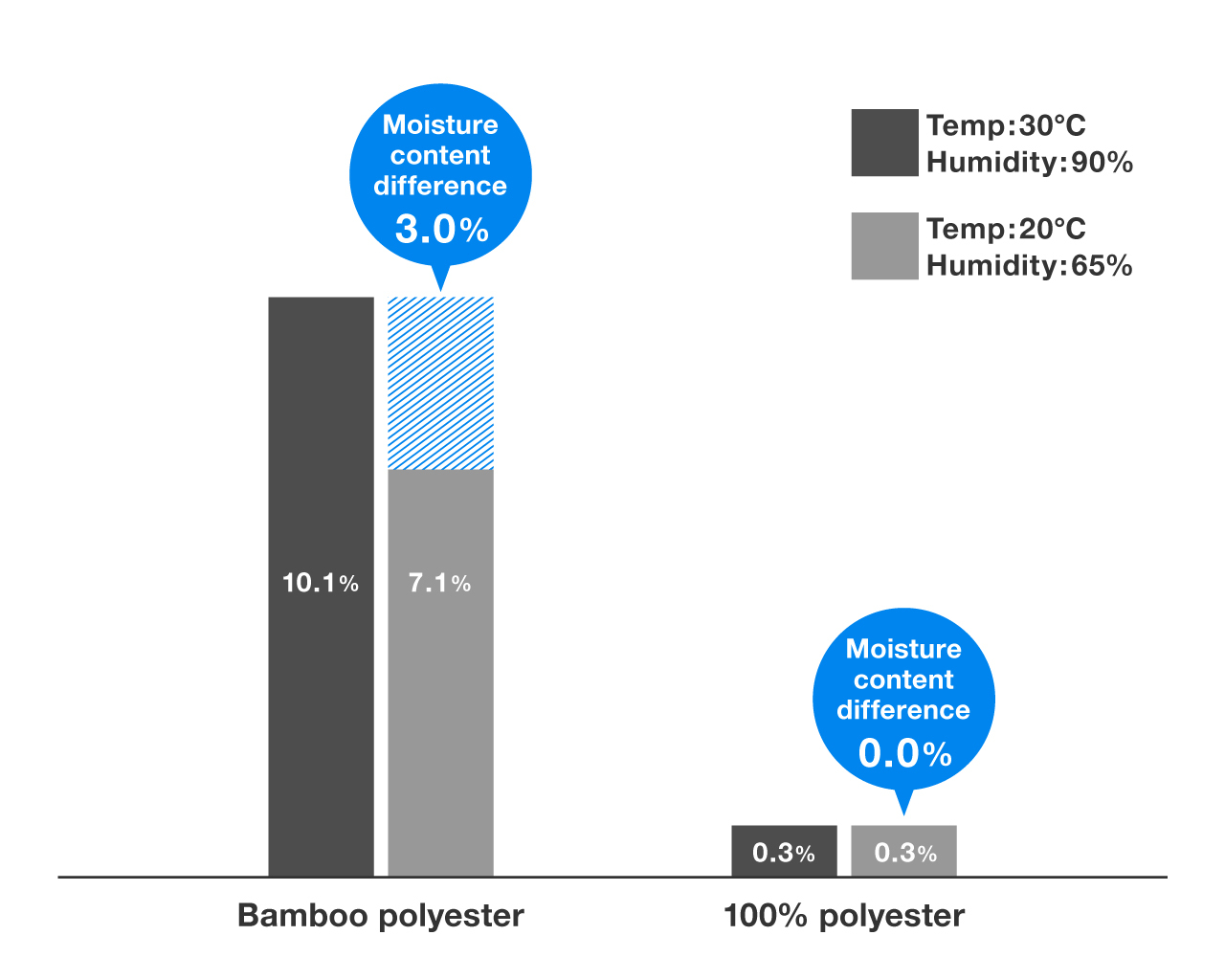 The chart below compares the moisture content inside the fibers in a hot, humid environment (a temperature of 30 degrees and 90% humidity) and an environment with optimal humidity (a temperature of 20 degrees and 65% humidity). We found that bamboo polyester maintains an optimal moisture content in both environments, and it has excellent humidity absorbency compared to a 100% polyester material.