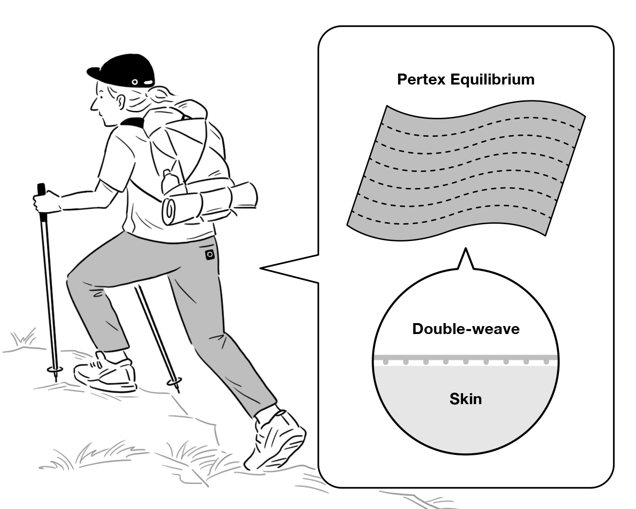 The Pertex Equilibrium has a unique double-weave structure with a soft two-directional stretch, which is achieved without the use of polyurethane often used in stretchable fabrics. This double-weave structure offers both great breathability and comfort, as the fabric is less prone to stick to wet skin.