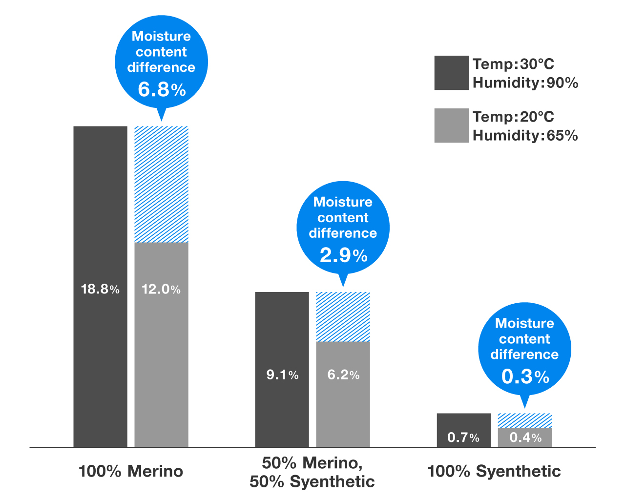The 100% merino fabric, as shown above, has a 6.8% moisture ratio difference. This means that our merino material can effectively control the moisture compared to the other fabrics, keeping you dry when it’s hot and humid while supplying a moderate amount of moisture when the humidity is low.