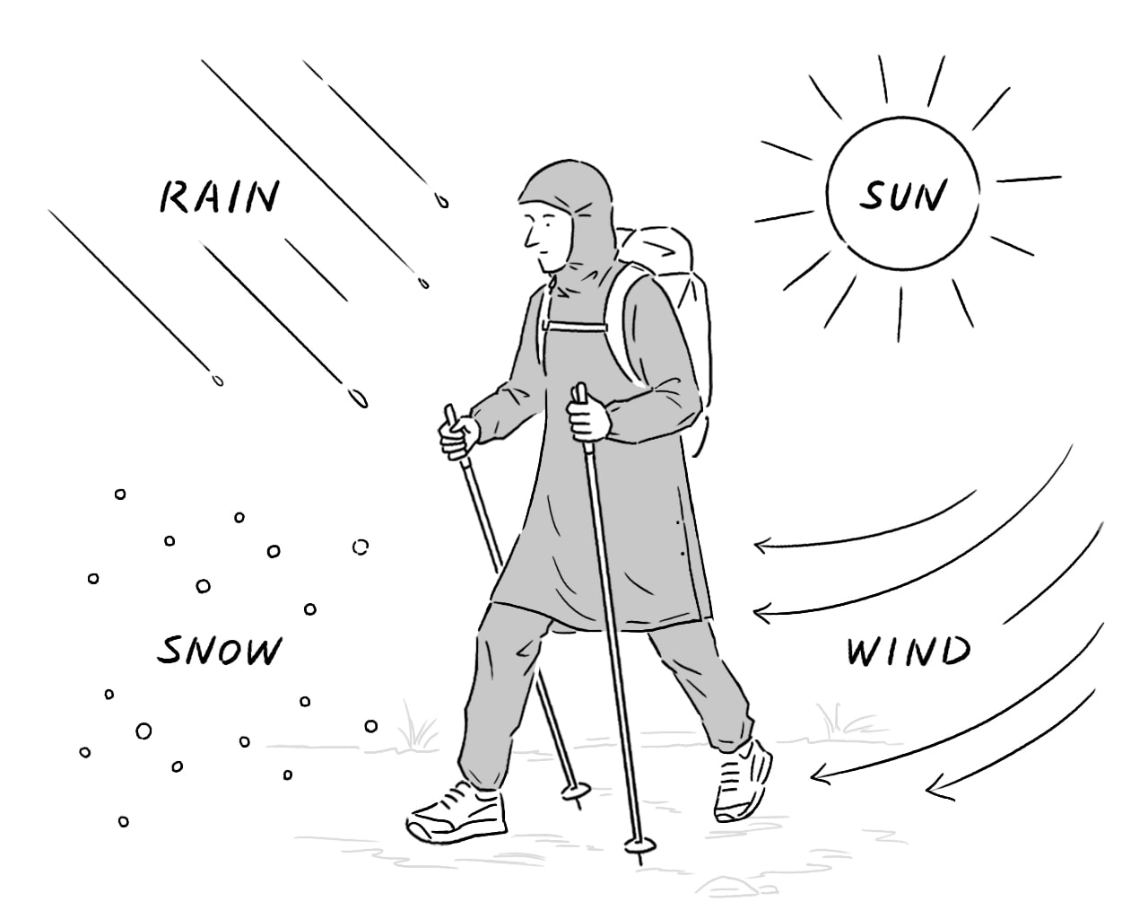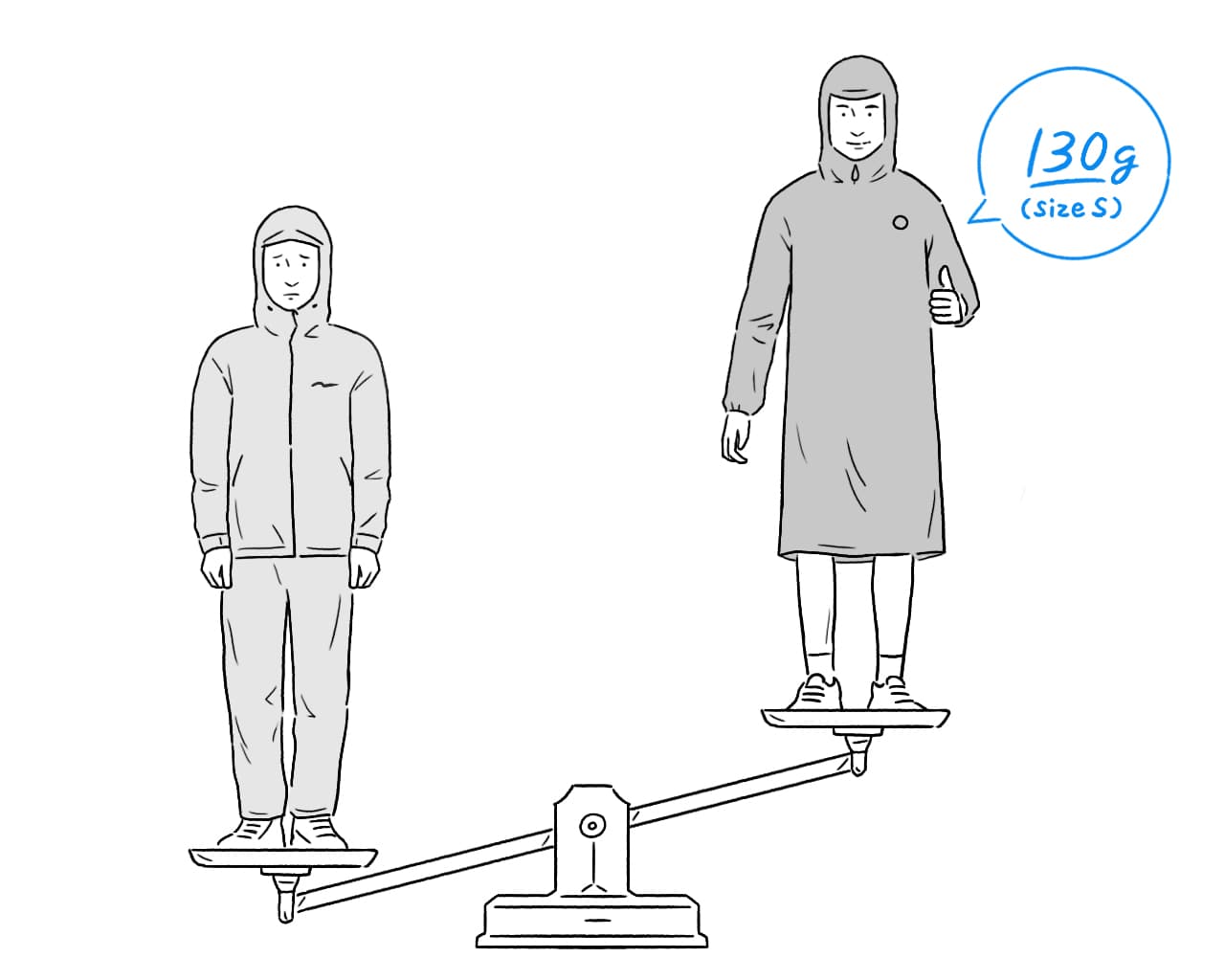 Weighing only 130g in size S, the Long Hoody is about half the weight of a normal set of rain jacket and rain pants, making your backpack lighter and more compact.
