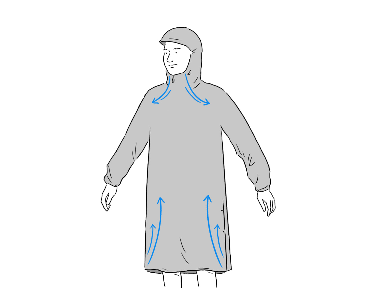 Your face and chin should not be covered by the hood. If they are covered, rain on the face may drip down inside the rainwear and you may get wet.