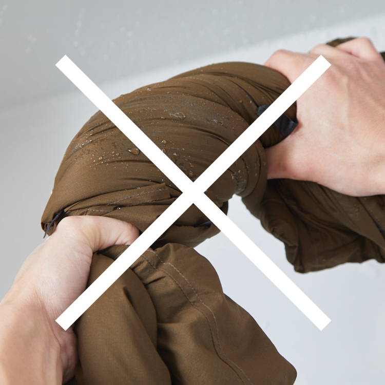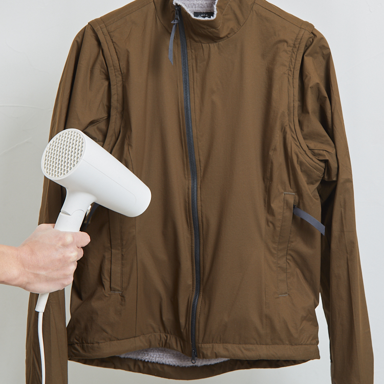 Water repellency is usually restored by the heat of a hair dryer. The initial water-repellent finish will gradually be weakened by friction during wear and washing. If you notice that the water repellency is not restored by the heat, it is probably time to try an outdoor-specific water-repellent spray or a dry cleaner’s water-repellent service. Do not use a tumble dryer or iron as high temperatures may cause shrinkage of the liner, becoming out of shape.