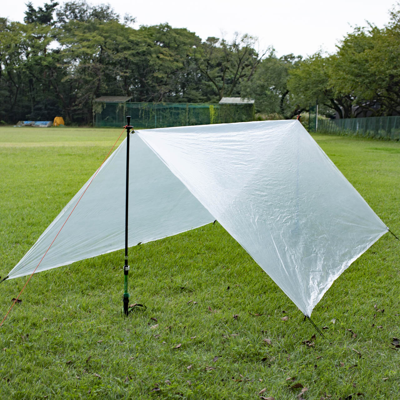 ものの1時間も経たずに完成した自作タイベックタープを近所の公園に持っていき、さっそく張ってみることにした。四隅をペグダウンしてポールを立てて伸ばし、グッとテンションをかけた時だった。