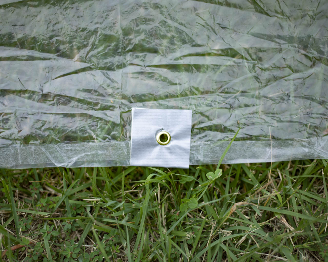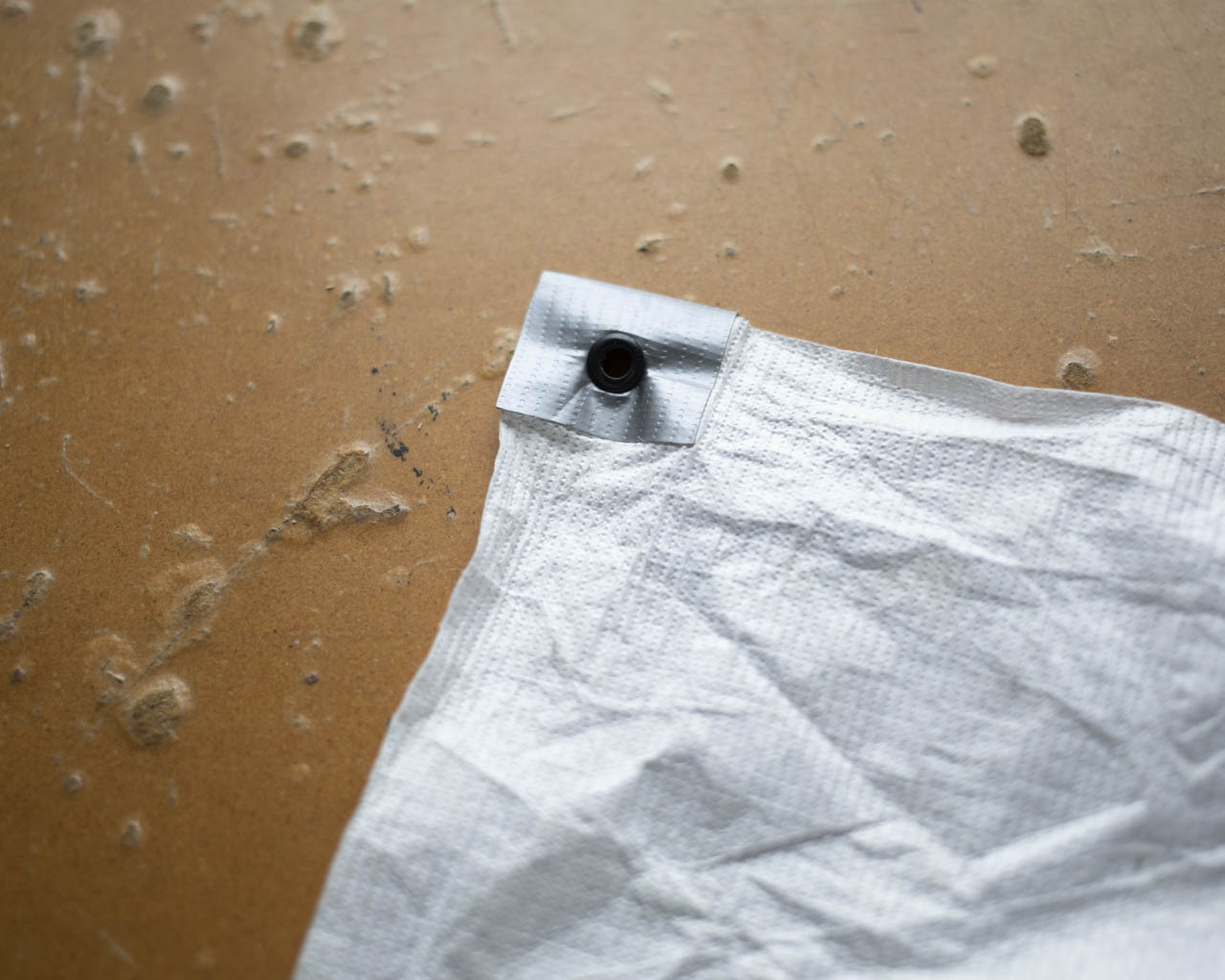 タイベックシートにハトメを付けるにあたっては、まず取り付け箇所をダクトテープ(布テープでも問題ないと思われる)で補強した上で穴を開け、ハトメを取り付けた。