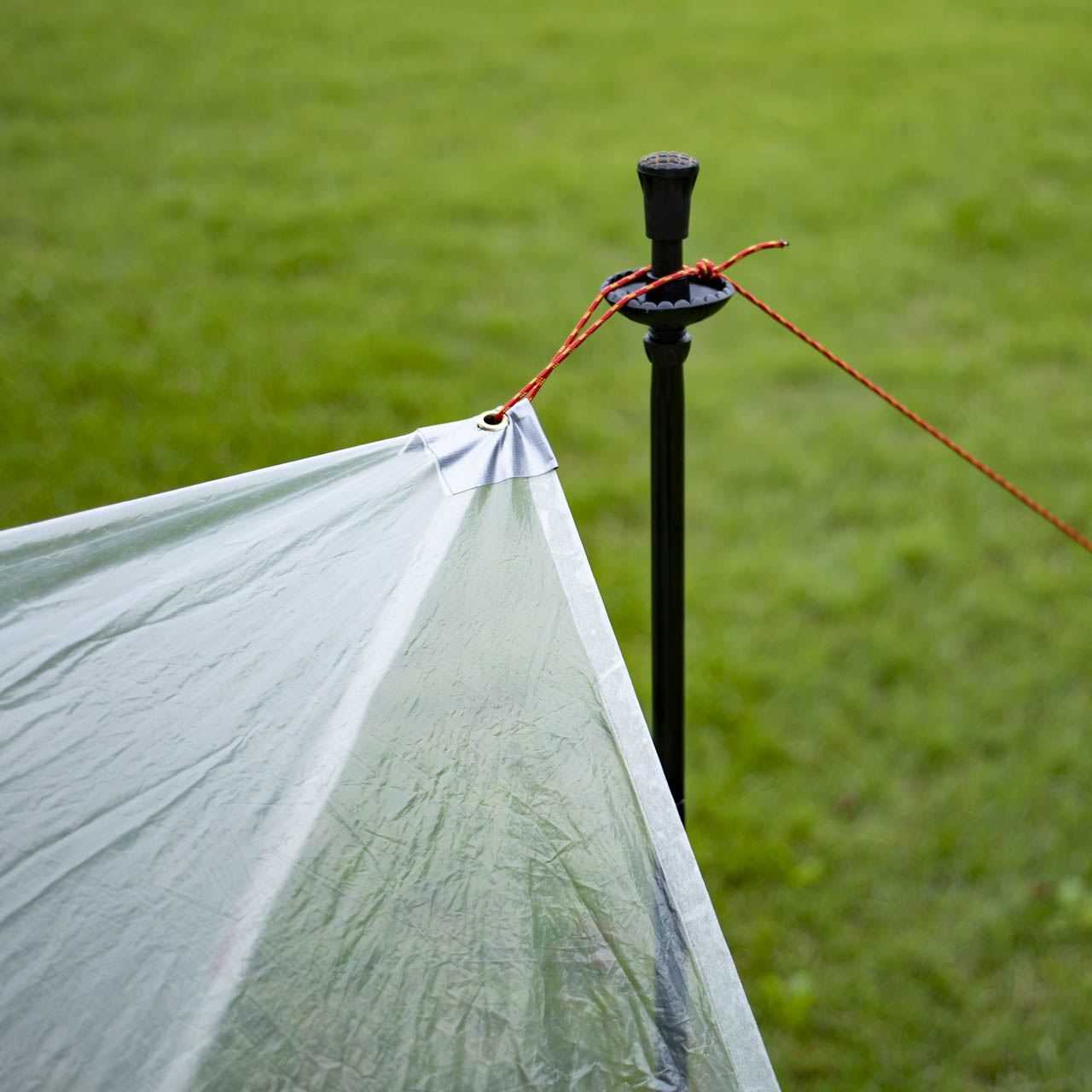 ファイントラックのツエルト用ガイラインは長すぎたので、半分に切って両端中央のハトメに取り付け、四隅のハトメには20cmほどのバンジーコードをループにして取り付けた(最初から壁を地面スレスレまで下ろすA型タープしか想定していないので、四隅にはコードストッパー付きのガイラインはいらないと判断した)。