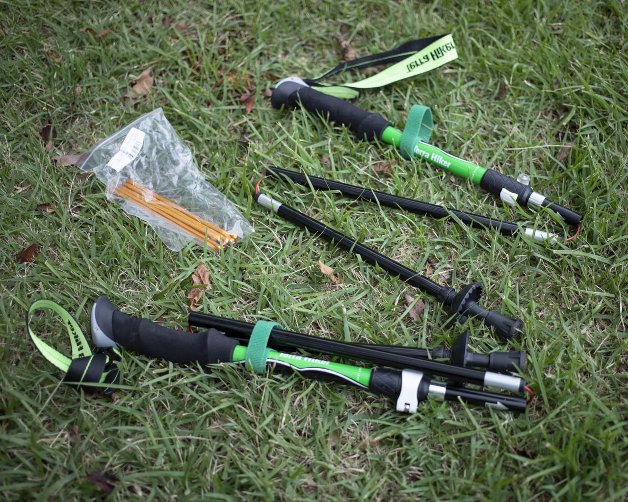 中華製ポール。どれでも良かったけど、購入の決め手は”Tera Hiker”というブランド名が気に入ったから。一度山で使ってみたけど、使用には全く問題なかった。中華製の軽量ペグも6本で300円。