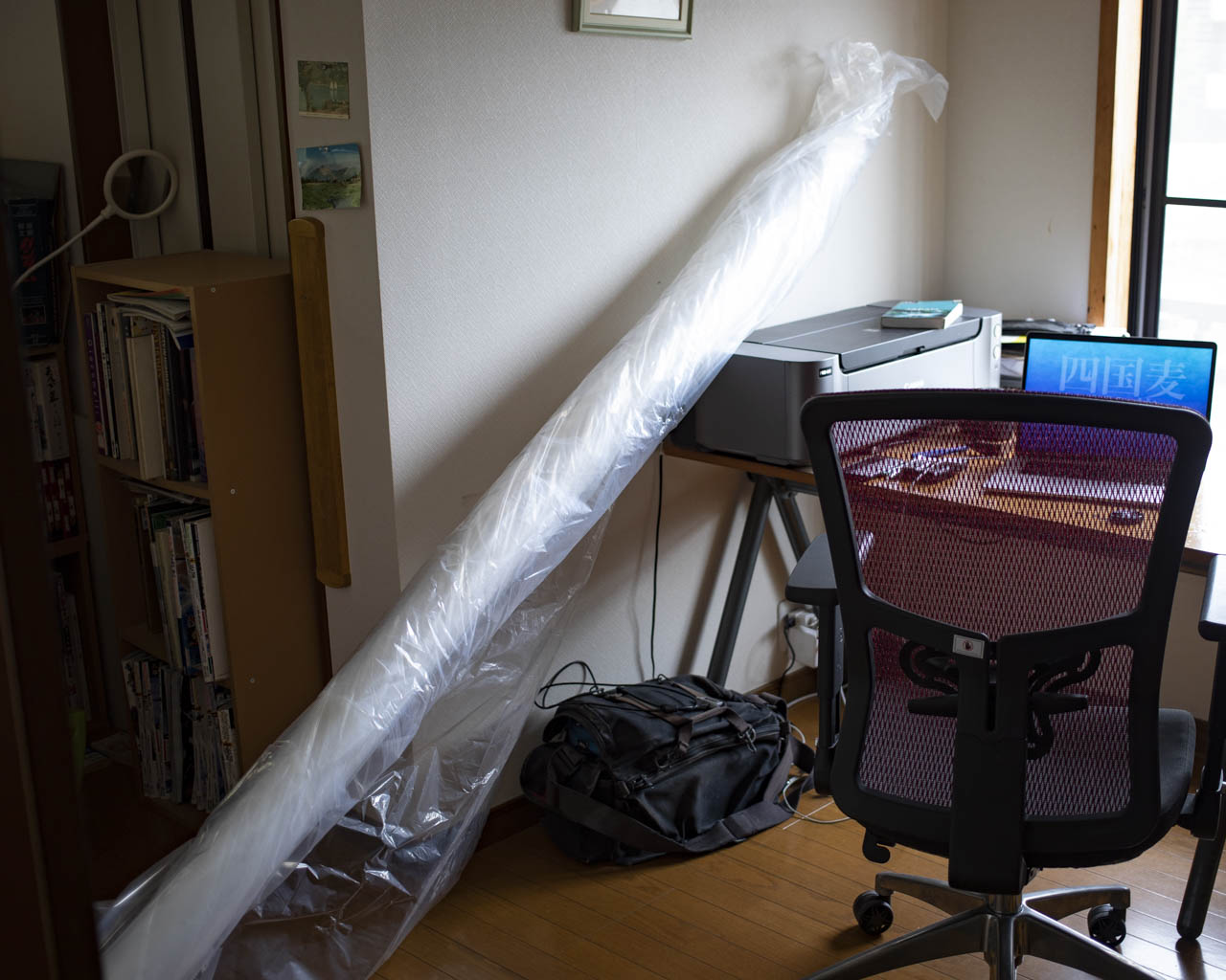 後に丹沢黒部さんのHIKERS’ CLASSICS#5で知ったことだが、現在の沢屋さんや渓流釣師さんの間で主に使われている農ポリは、3.6m幅が二つ折になった1.8m幅 x 100mロールの「透明養生シート」がメインとのこと。1.8mのロールなら、そんなに苦労しなかったのに……。