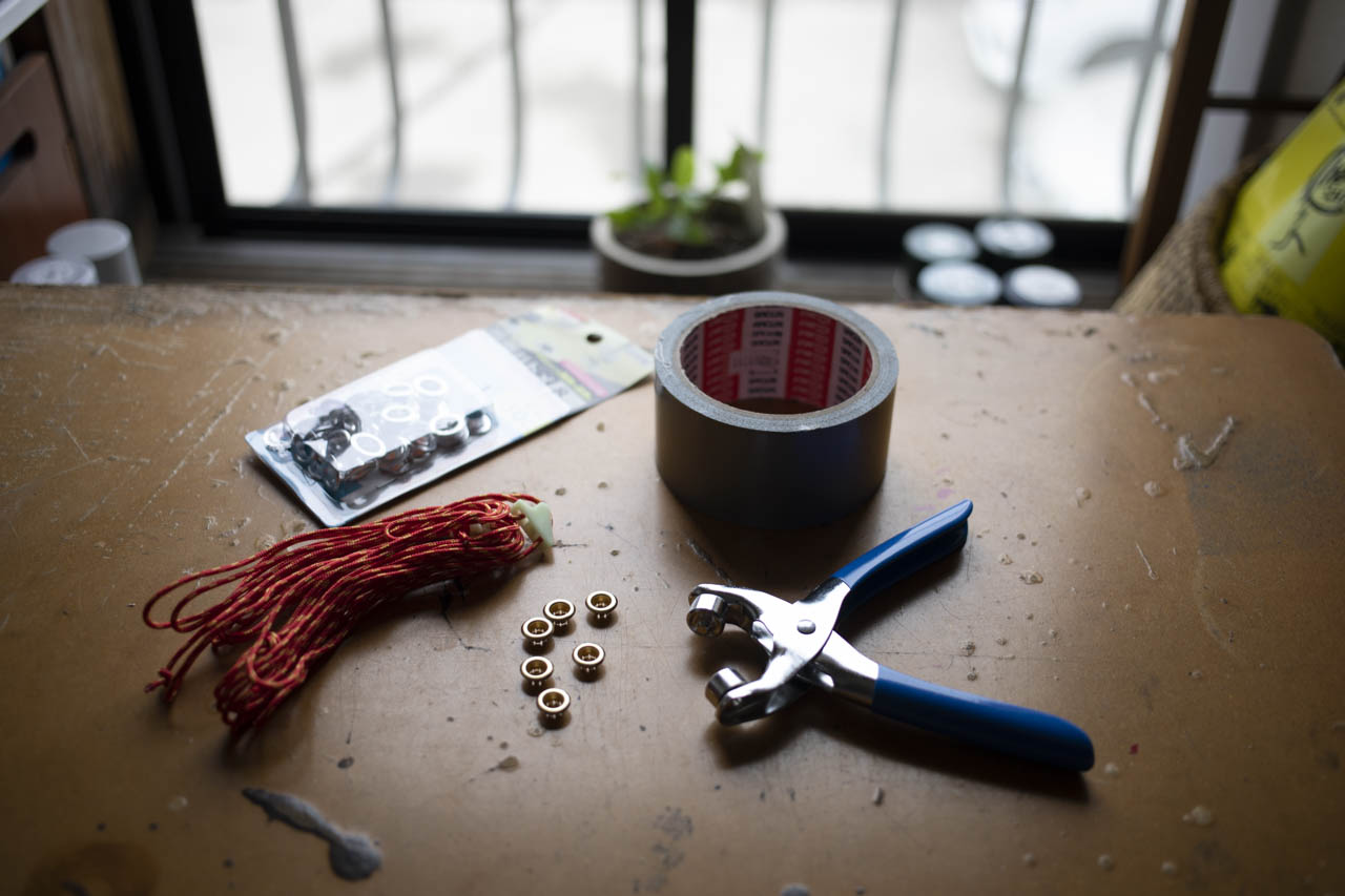 100円ショップで購入したハトメとハトメパンチ。そして家にあったダクトテープと、石井スポーツで購入したファイントラックのツエルト用ガイライン。