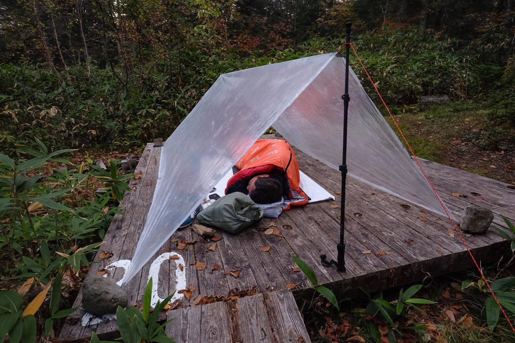 とまあ今回はこれで終わるつもりであったが、先日、初秋の尾瀬を歩く機会があり、尾瀬沼でのキャンプしたので、早速この農ポリタープで寝てみることにした。なかなかに衝撃的な見た目なので、キャンプサイトでもいちばん奥の人目につかない場所に張ったことは言うまでもない。