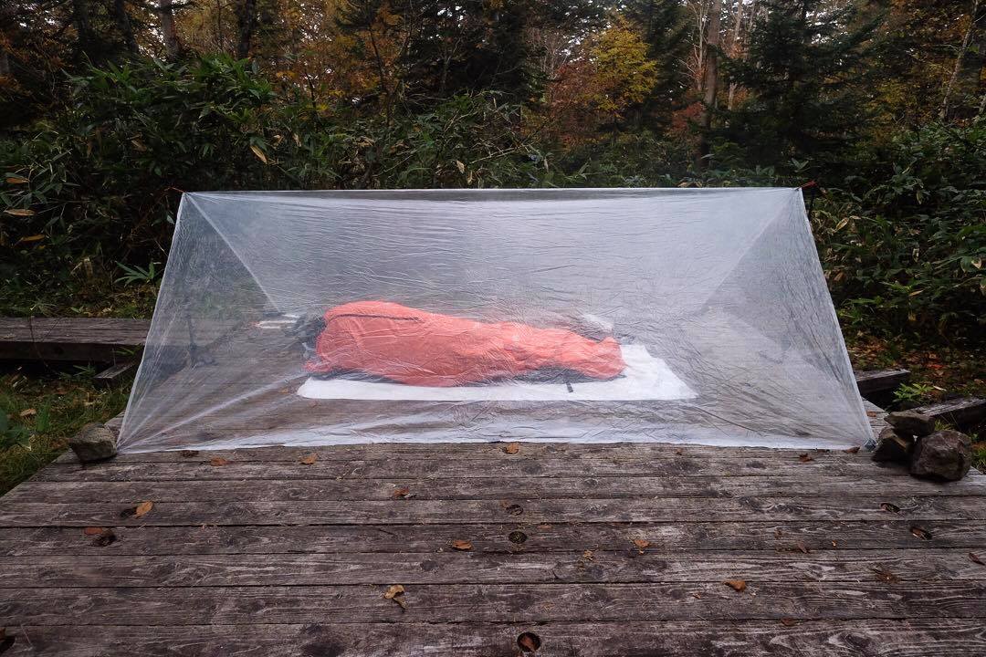また、素材自体も透明スケスケなので、これを堂々チープハイクなシェルターとして紹介するのは、正直、気が引けた。