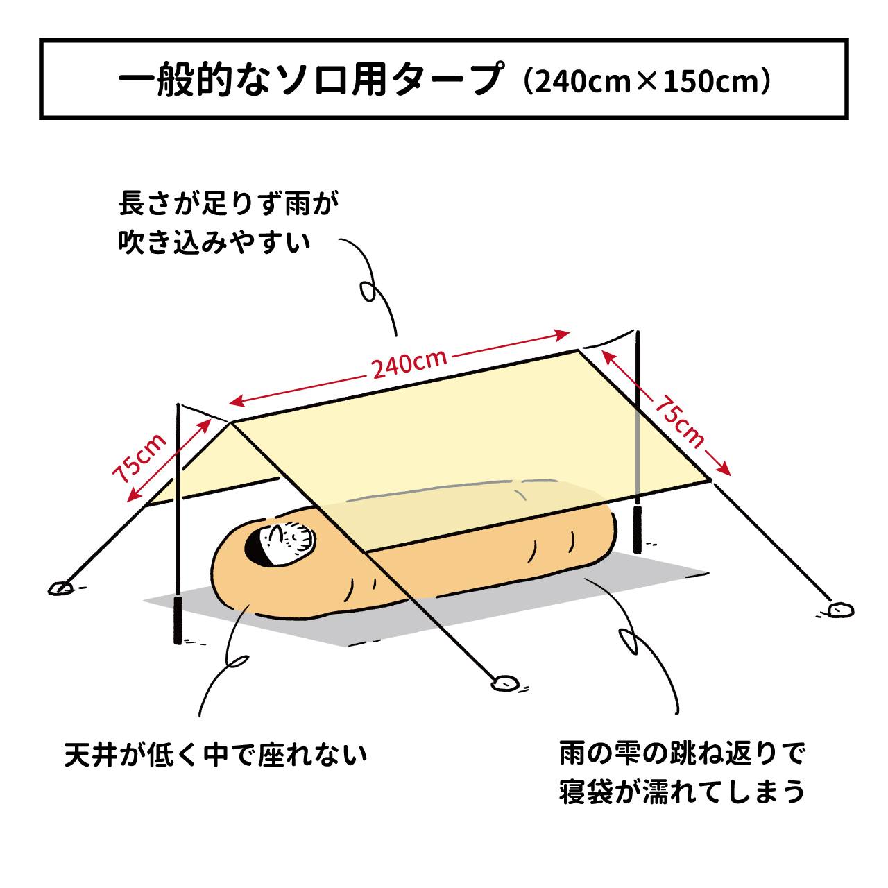 一般的なソロ用タープのサイズは、150cm x 240cm(5ft x 8ft)であることが多い。だが、このサイズはもとの生地幅から割り出されたサイズであり、実際の雨天時の運用にはビビィやシュラフカバーを使わなければ寝袋が濡れてしまう可能性が大いにある。確かに、初心者にいきなりこれで山で寝ろというのは酷だし、僕自身もあまりしたくない。