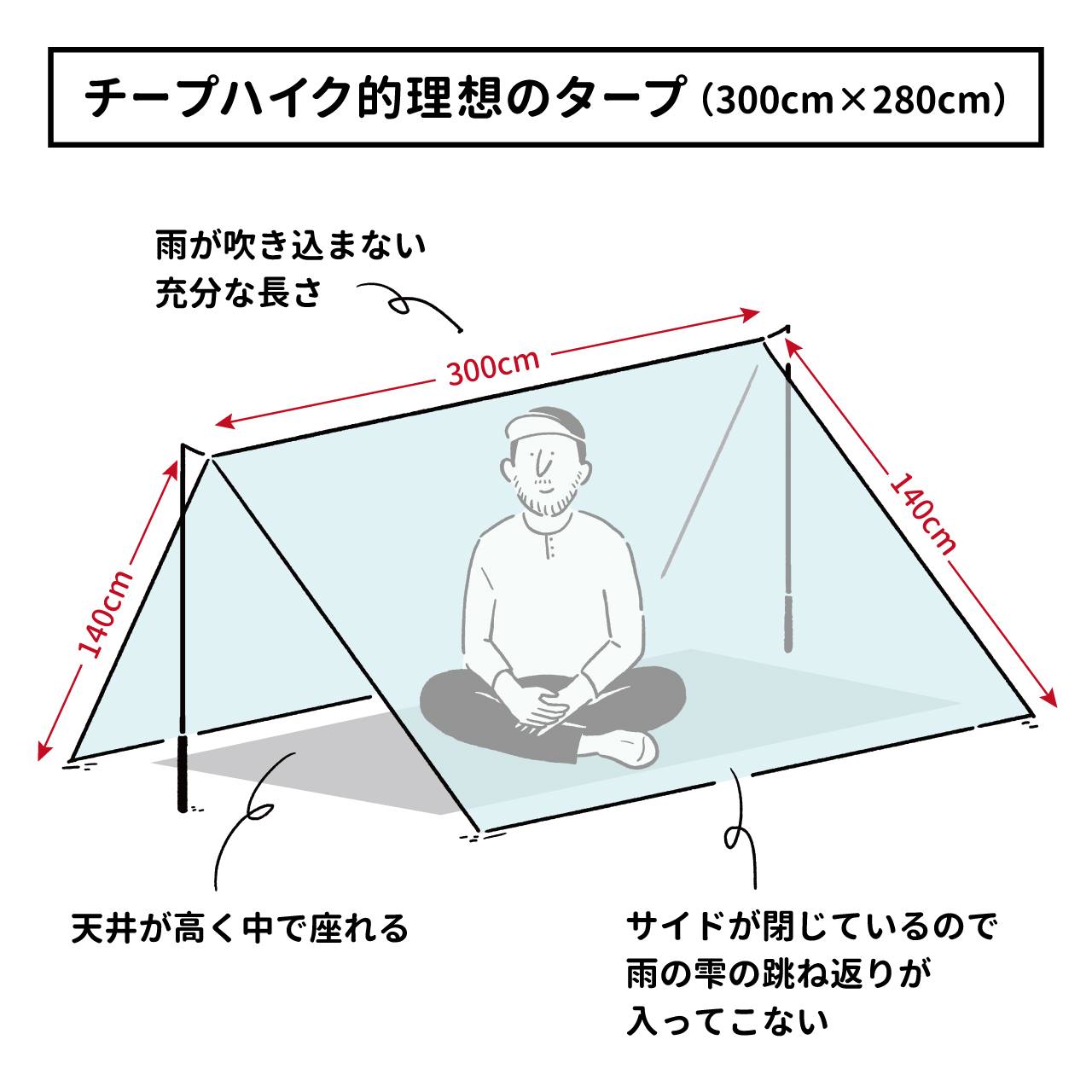 だが、生地幅をその倍に取った2人用サイズである280cm x 300cmであれば、雨天時でも大人ひとりなら中でストレスなく過ごせるはずだ。