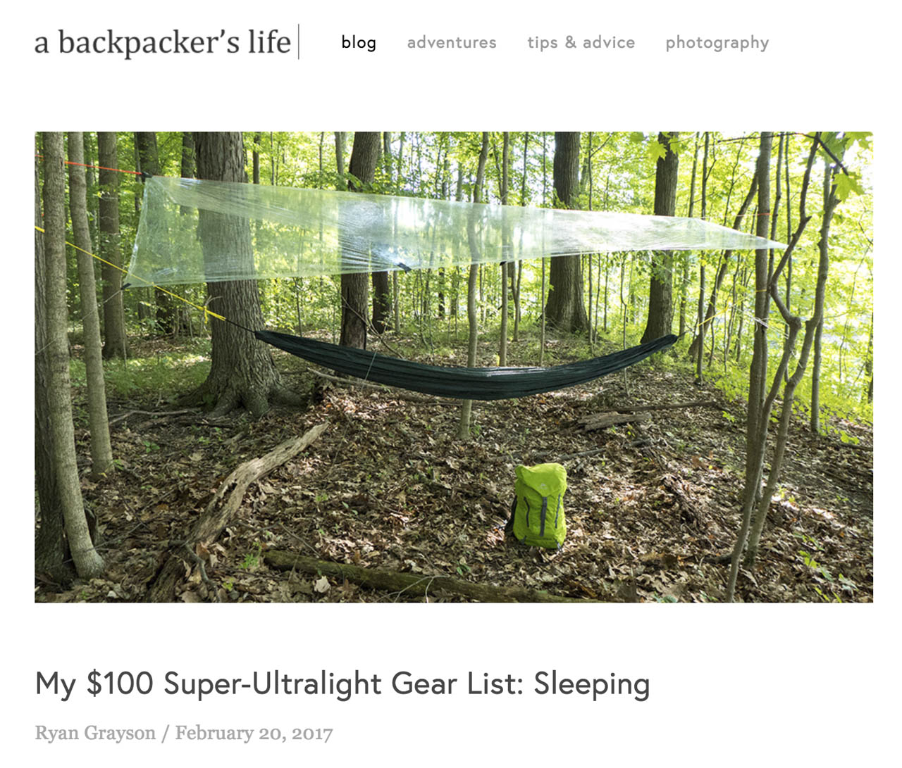Ryan Graysonという方が、運営されている『a backpacker’s life』というブログで、衣服を除いた全装備を100ドル以下、ベースウェイトを5ポンド(約2.3kg)に抑える方法論を紹介しており、”Sleeping”の項目を見ると、”Polycryo”という農ポリシートにそっくりな透明素材で、タープを作っているではないか!