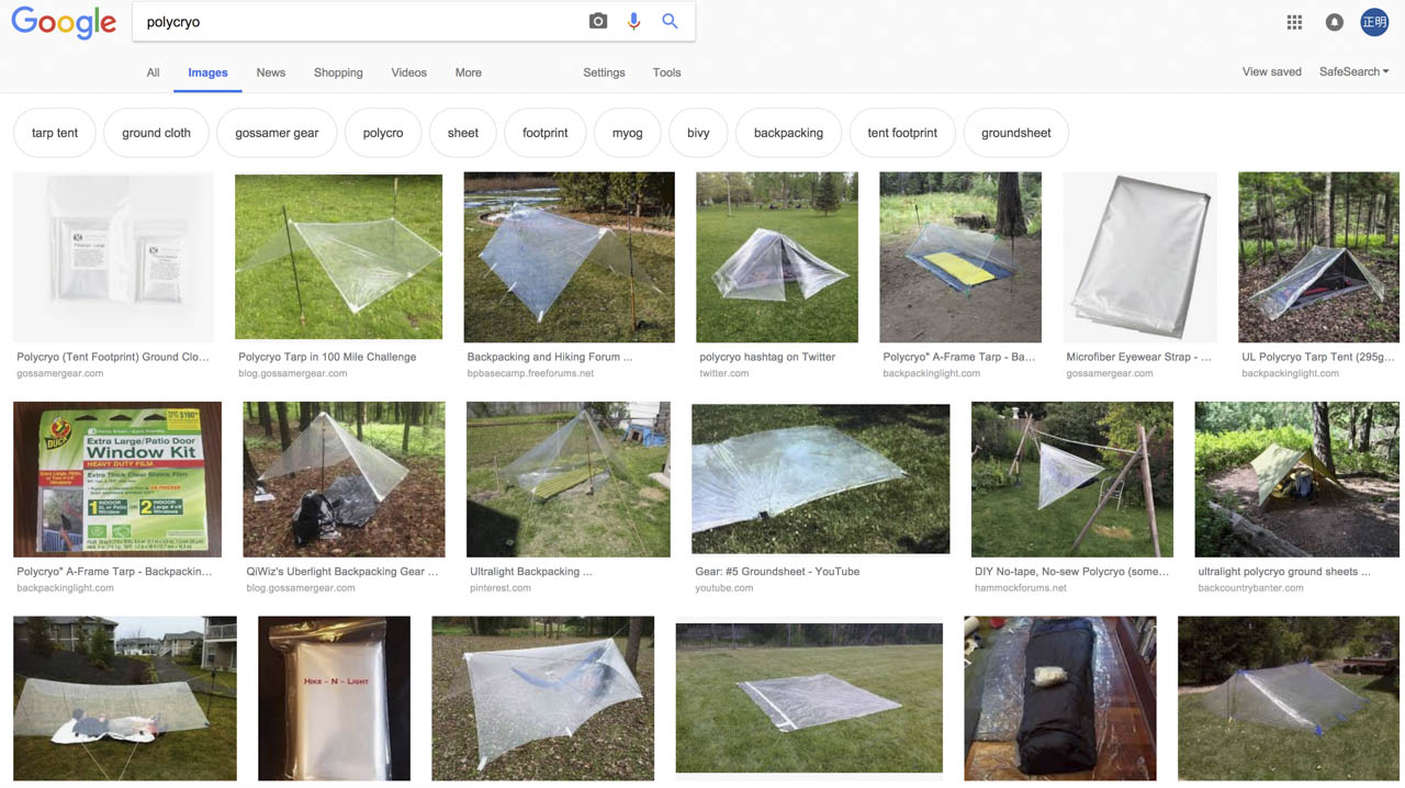 さらにグーグル先生に”Polycryo”と打ち込み画像検索してみると、ほとんどタープに埋め尽くされるほどで(中にはこれで2ポールのシェルターを作ってしまっている猛者もいる!)、北米のULシーンではとっくに定番のようだ。日本人でも知っている人は知っていたのだろうけれど、僕は不勉強ながら全く知らなかった。