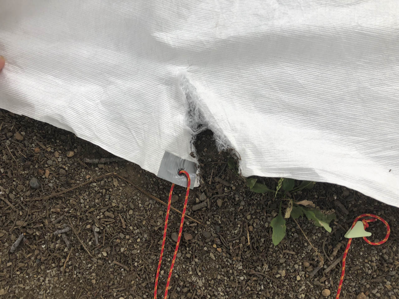 や、破けた…。ポール用ガイラインのそばの生地が、あっけなく裂けてしまった……。