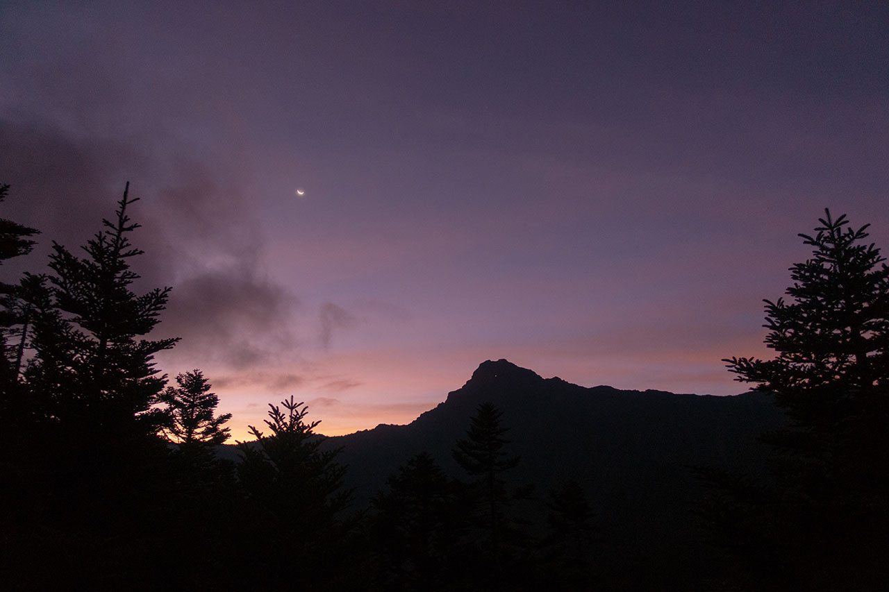 そのまま西峰で待機していると空が明るくなってきた。頂上付近は樹林で遮られているので、登山道の見通しがきく場所まで降りてご来光を見ることにした。空が紫に染まり玉山のシルエットが浮かび上がる光景を見て、少しは西峰にも来た甲斐があったと思った。