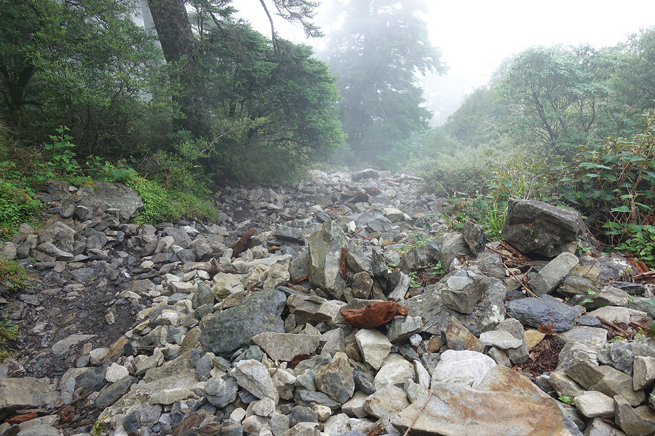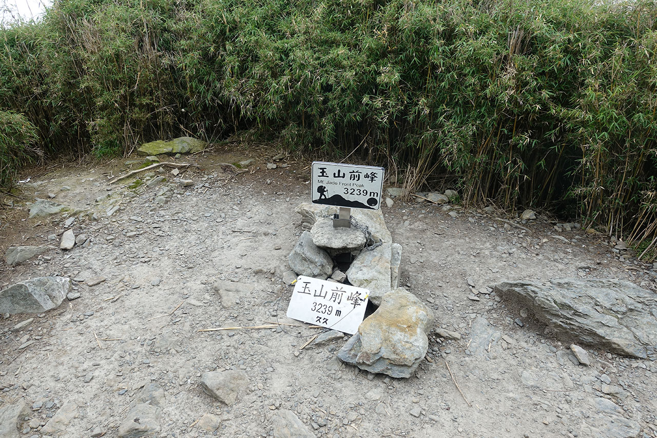 玉山前峰は玉山登山口のごく近くにそびえており、数時間で登れるやさしい山だと聞いていた。山荘を出て登山道を下っていくと、ほどなくして前峰への登山分岐にたどり着いた。前峰には皆この分岐に荷物を置いて軽装で登るらしい。私もザックを置いた。