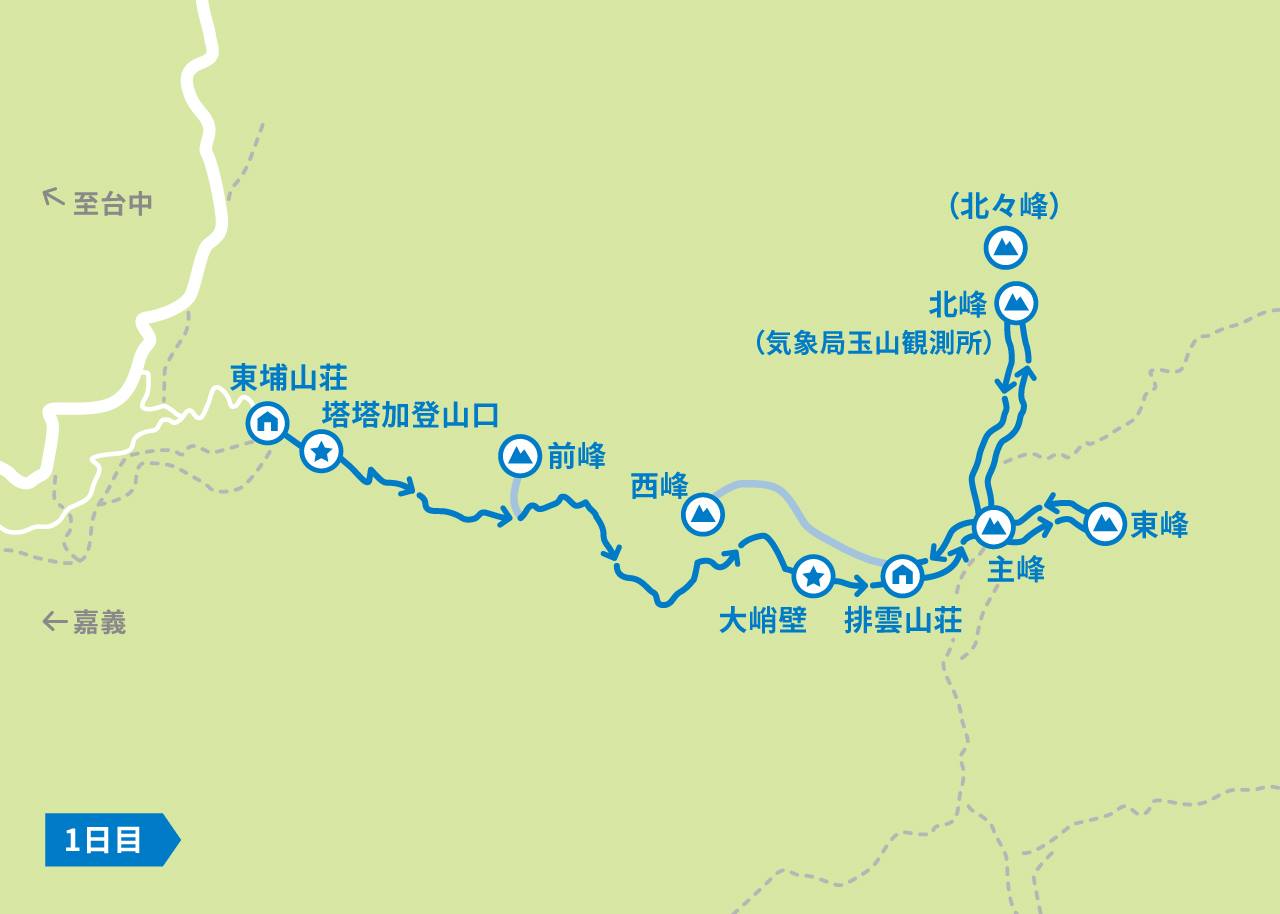 1日目の行程:東埔山荘→塔塔加登山口→排雲山莊→主峰→東峰→主峰→北峰→主峰→排雲山莊泊