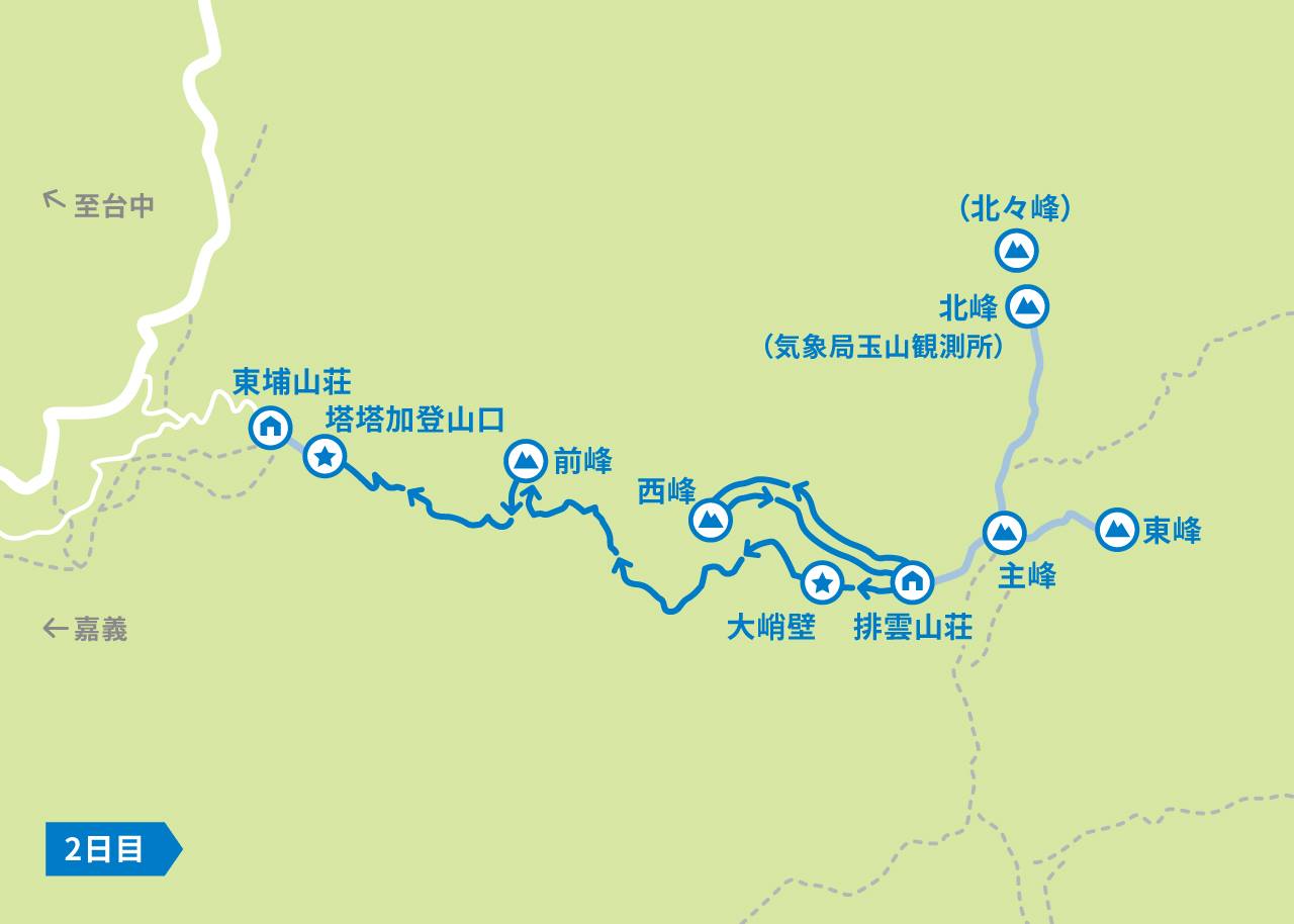 2日目の行程:排雲山莊→西峰→排雲山莊→前峰→塔塔加登山口