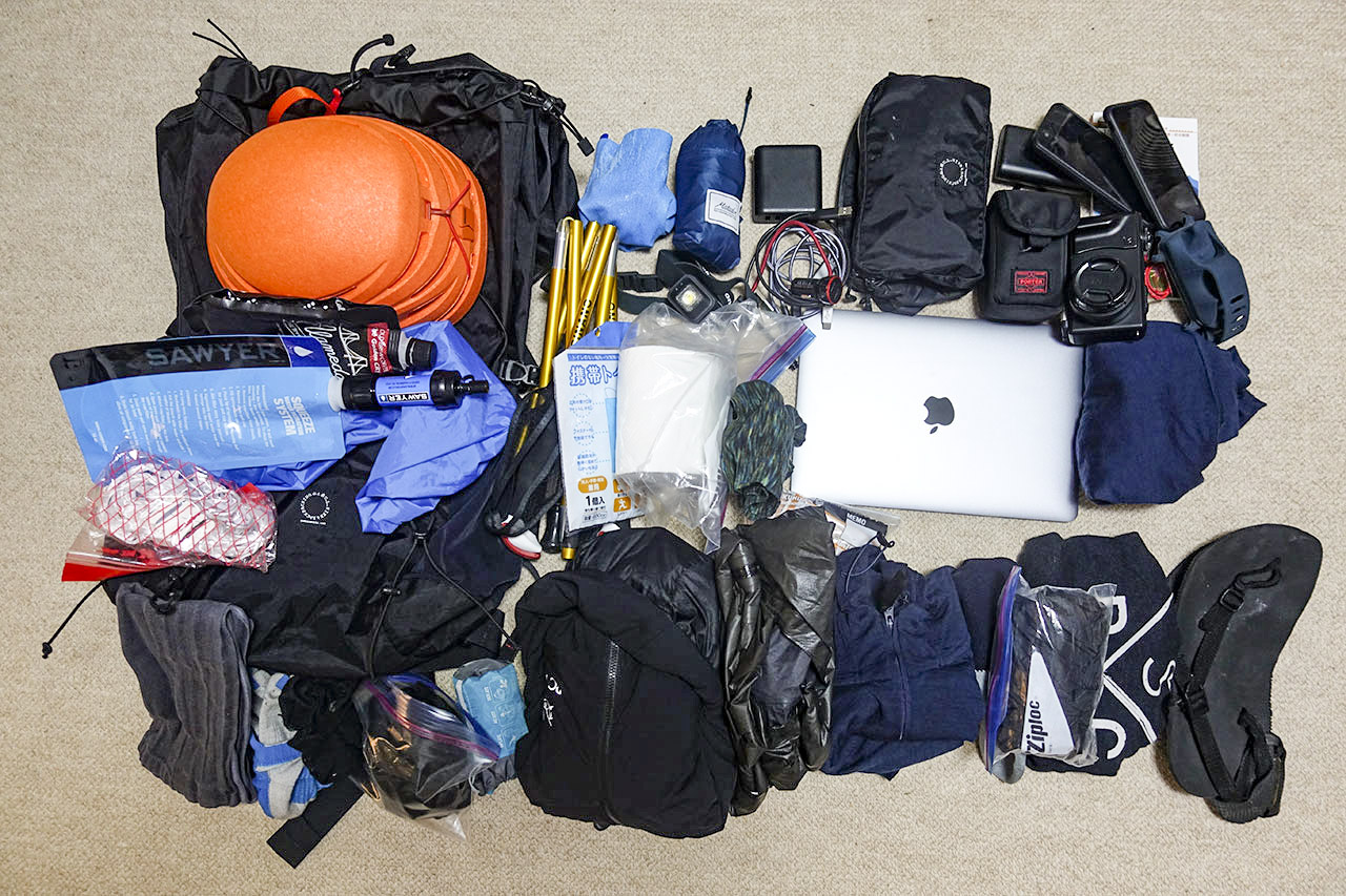 他にもカメラ3台やノートPCなどいろいろ荷物が嵩んでしまい総重量は7kg弱、登山時にはPCなどを置いていけるので5.5kgくらいの予定となったが、自分的には十分重い。山と道MINIで軽やかに渡航したかったが、結局山と道Threeを背負っていくことになった。