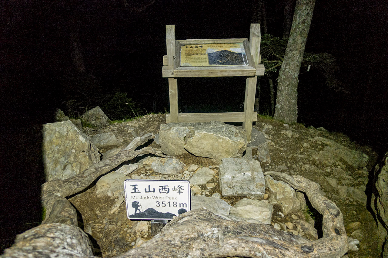 西峰は山荘から拍子抜けするほどすぐに到着した。たぶん1時間もかからなかったと思う。暗闇の樹林帯の中、唐突に頂上を示す看板があった。暗いことを差し引いても眺望はほぼないと思われたが、何度確かめてもやはりこれが頂上らしい。正直、「微妙…」という感情が拭いきれない。
