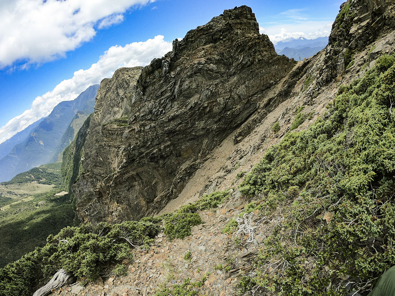 東側にはこれまでにインターネットや本で見てきた写真と同じ、迫力の岩壁がそそり立っていた。意外に近く見える。正直3時間もかからないと感じたが、間に合わなそうであれば北峰はパスしてもいいので東峰だけには行こうと思った。2人にお礼を言って主峰を降り、東峰の方へと道を下った。