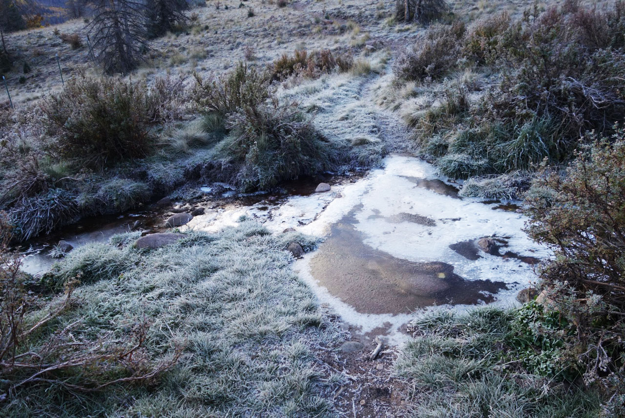 少し歩くと前方に小川が見えた。やっと水にありつけると喜んだが、なんと小川は凍ってしまっている。それほどまでに冷え込んでいたとは予想外だ。幸いにも氷の下に僅かに流れがあったので、トレッキングポールの先で何度か突き、表面の氷を砕いて水を汲む。