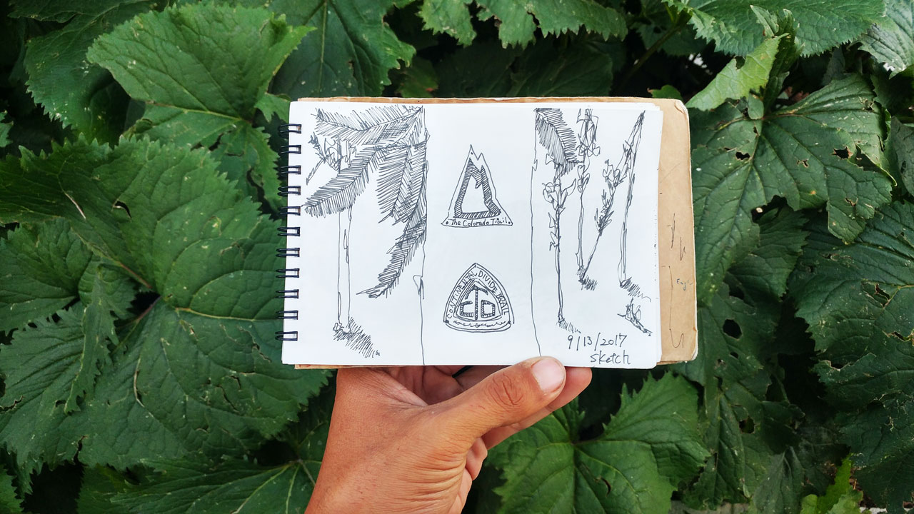 CDTとコロラド・トレイルのサインが打ち付けられた木のスケッチ。