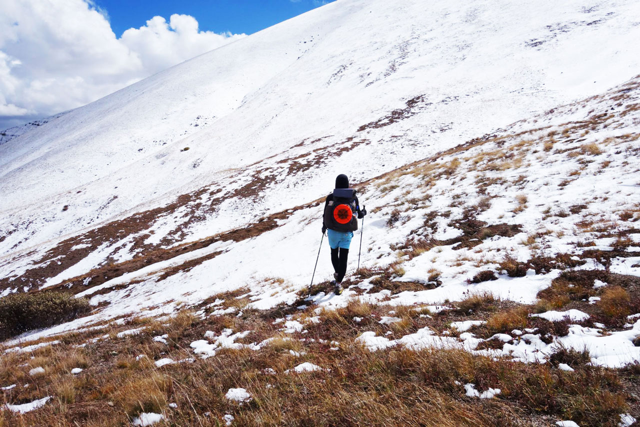 越えるべき峠の位置ははっきりと目視できるので、その方向を目指して黙々と歩き続ける。少しでも指先に体温が戻って、この痛みから解放してくれることを祈ったが、痛みは増すばかりだ。指先の感覚がないので、草の上に積もった雪に足を滑らせて、何度も転倒する。その度にバックパックに取り付けたフリスビーが外れていないか確認しなければならかった。