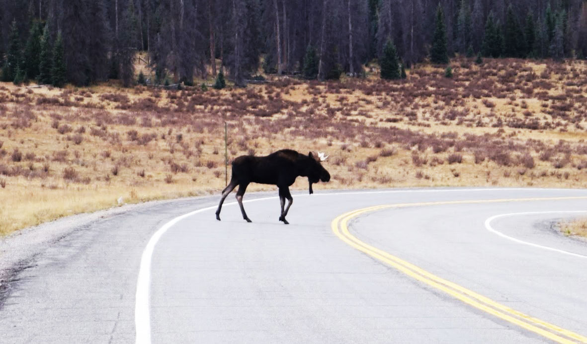 ムースはこちらには目もくれず、ハイウェイを横断しようとしている。僕とジョンは思わず立ち上がり、大きな巨体に似合わない細い足を動かしながら優雅に進む姿を、目を凝らして見つめる。
