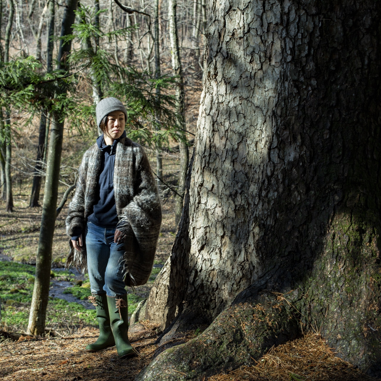 「おはようございます。コーヒー淹れたんで、よかったら中に入りません?」と嬉しい言葉。Dillの外壁には薪が積み上げられているが、あまり見たことのない節が多い薪だった。「割るの大変そうだなぁ」と思いながら、木の種類を聞いてみるとスモモの木とのこと。